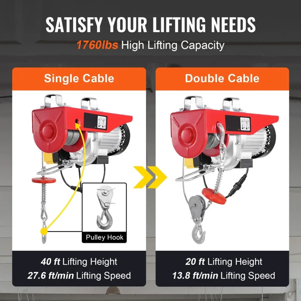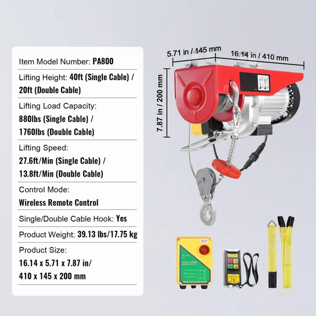 Vevor Electric Hoist, 1760 Lbs 120v Electric Winch With 328 Ft Wireless Remote Control, 40 Ft Single Cable Lifting Height, Single/double Slings