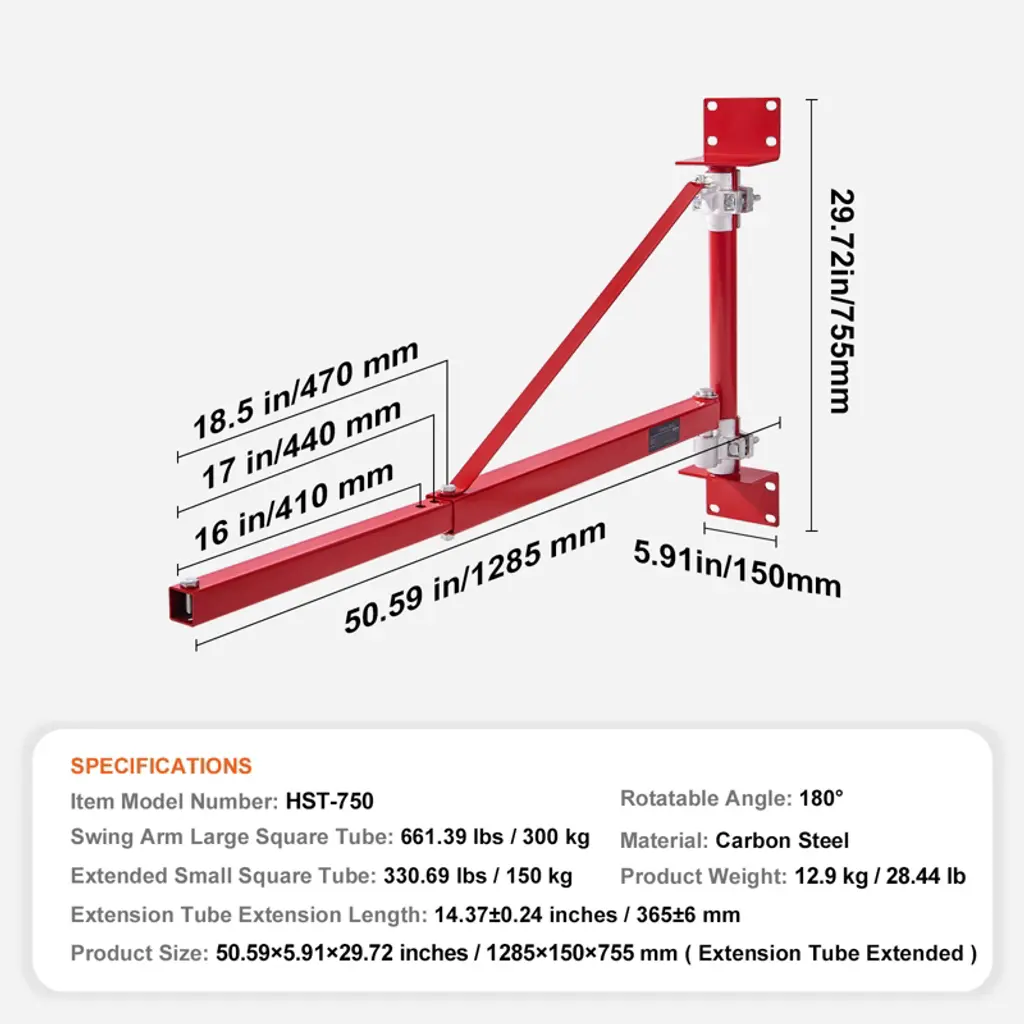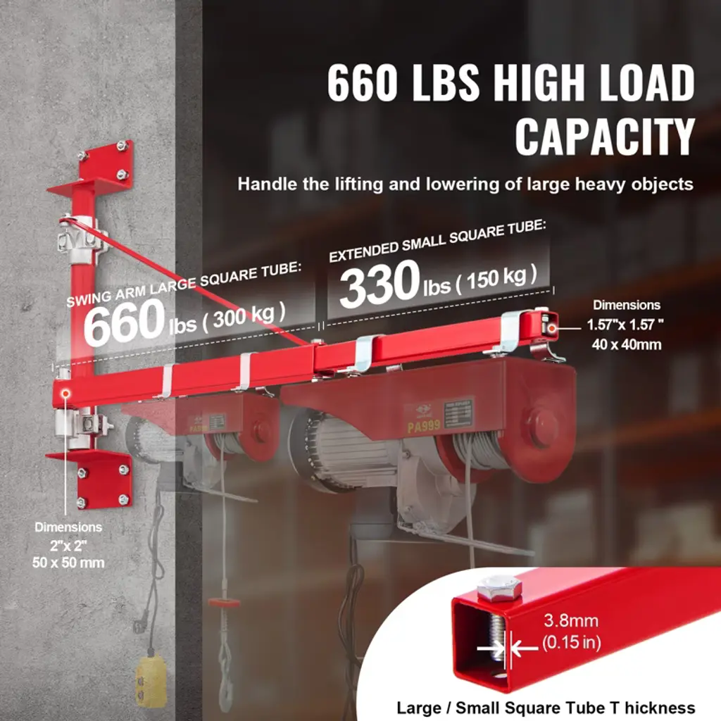 Feature: High Load Capacity: Our hoist support arm effortlessly handles weights up to 661.39 lbs (300 kg), while the extended small square tube supports loads up to 330.69 lbs (150 kg). The capacity ensures stability and security in the workspace, thus enhancing efficiency when handling heavy equipment or materials. Industrial-Grade Material: Crafted from industrial-grade carbon steel, our hoist arm boasts a sturdy triangular structure and advanced reinforcement technology. Its sleek surface coating stands up to moisture, while the thickened steel plate design minimizes swaying during use. Security latches keep all components securely in place for peace of mind. Adjusts to Your Needs: Enjoy the flexibility of 180-degree angle adjustment with this electric hoist support arm, expanding your operational range for smoother, more efficient lifting tasks. No more constant repositioning—get the job done with ease. Convenient Installation: Say goodbye to complicated setups! Our electric hoist arm can be assembled in minutes, and no special skills are required. Whether you're a pro or a novice, you'll be up and running in no time. Versatile Performance: From home renovations to warehouse operations and factory workshops to repair departments, our electric hoist swing arm is your go-to solution for lifting, moving, and more. Elevate your projects with confidence wherever you are. Package Content: 1 x Hoist Support Arm Kit