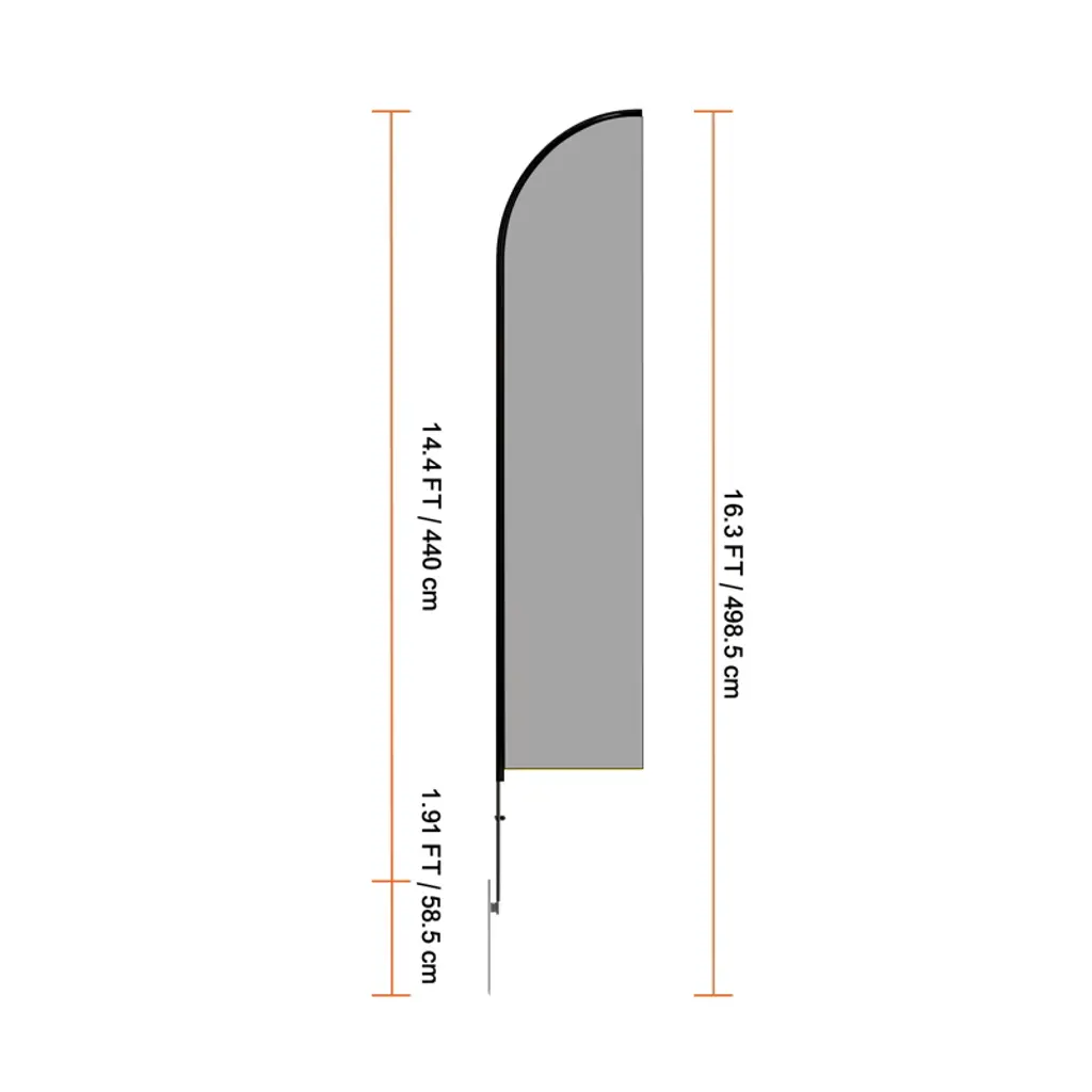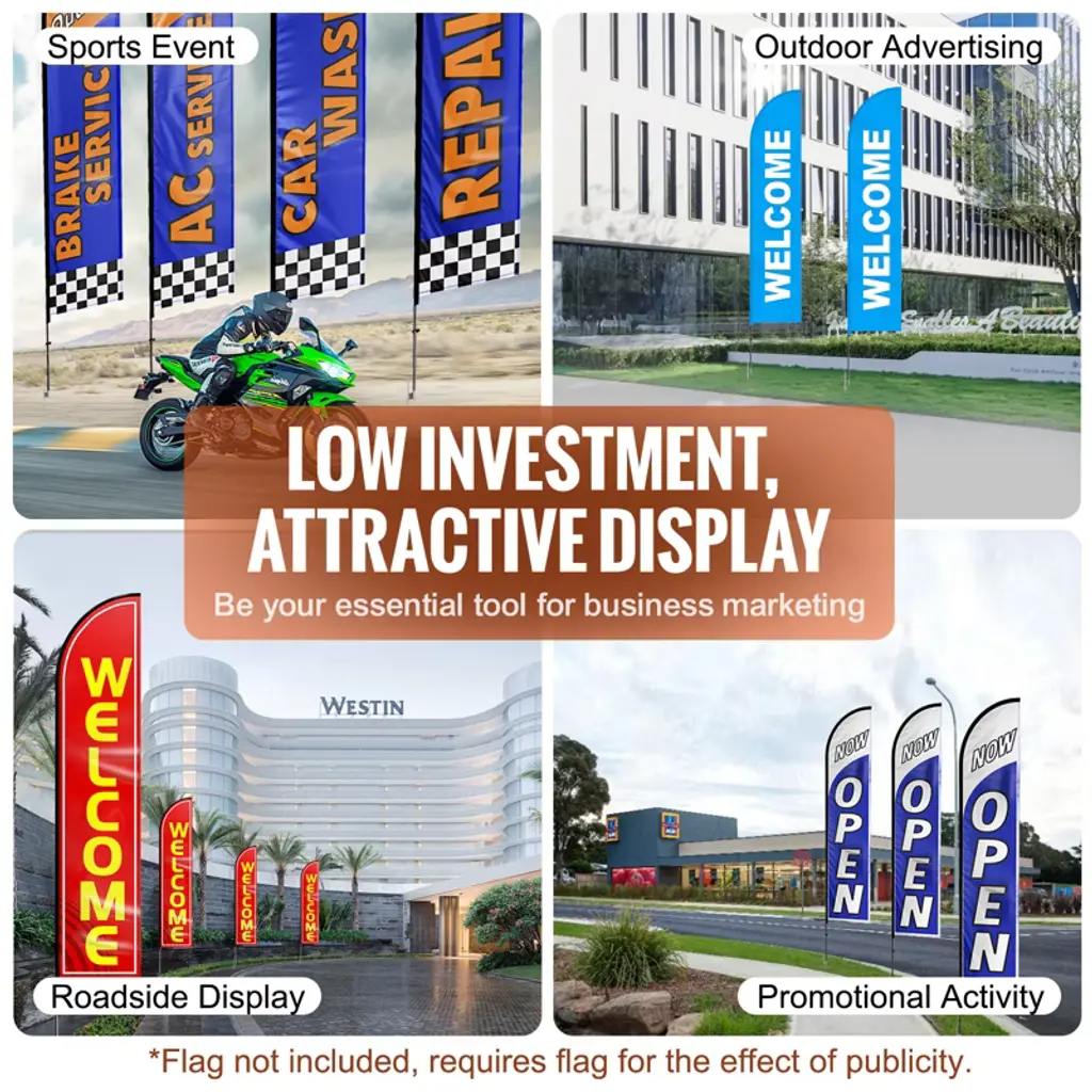 Feature: Premium Material: Crafted from high-quality aluminum alloy and fiberglass with a 1mm wall thickness, this feather flag pole kit is both lightweight and strong. The fiberglass top is corrosion-proof and bend-resistant, offering excellent wind and rust resistance for long-term outdoor use. Large Size, High Visual Impact: The total height: 16.3 ft (including ground stake), the flagpole height: 14.4 ft. Its large size enhances the flag's visibility and draws attention from a distance, ideal for outdoor advertising and events. (Flag not included) Quick Setup, Easy Disassembly: The swooper flag pole kit with a simple design features snap-lock connections and plug-in ground stakes for quick installation and takedown. It is perfect for commercial activities or temporary displays, allowing you to deploy quickly and efficiently. Portable and Convenient: With a dedicated storage bag, this advertising flag pole is easy to carry and set up for outdoor events, trade shows, or temporary displays. Its portability ensures you can display your flag anywhere, meeting diverse needs. Cost-Effective Marketing Tool: Ideal for various feather or teardrop flags, these banner flag poles suit various commercial and event settings. It is a cost-effective choice for increasing brand visibility in outdoor activities, retail storefronts, or busy streets. Package Content 3 x Pack of Feather Flag Poles 1 x Storage Bag 3 x Ground Spikes