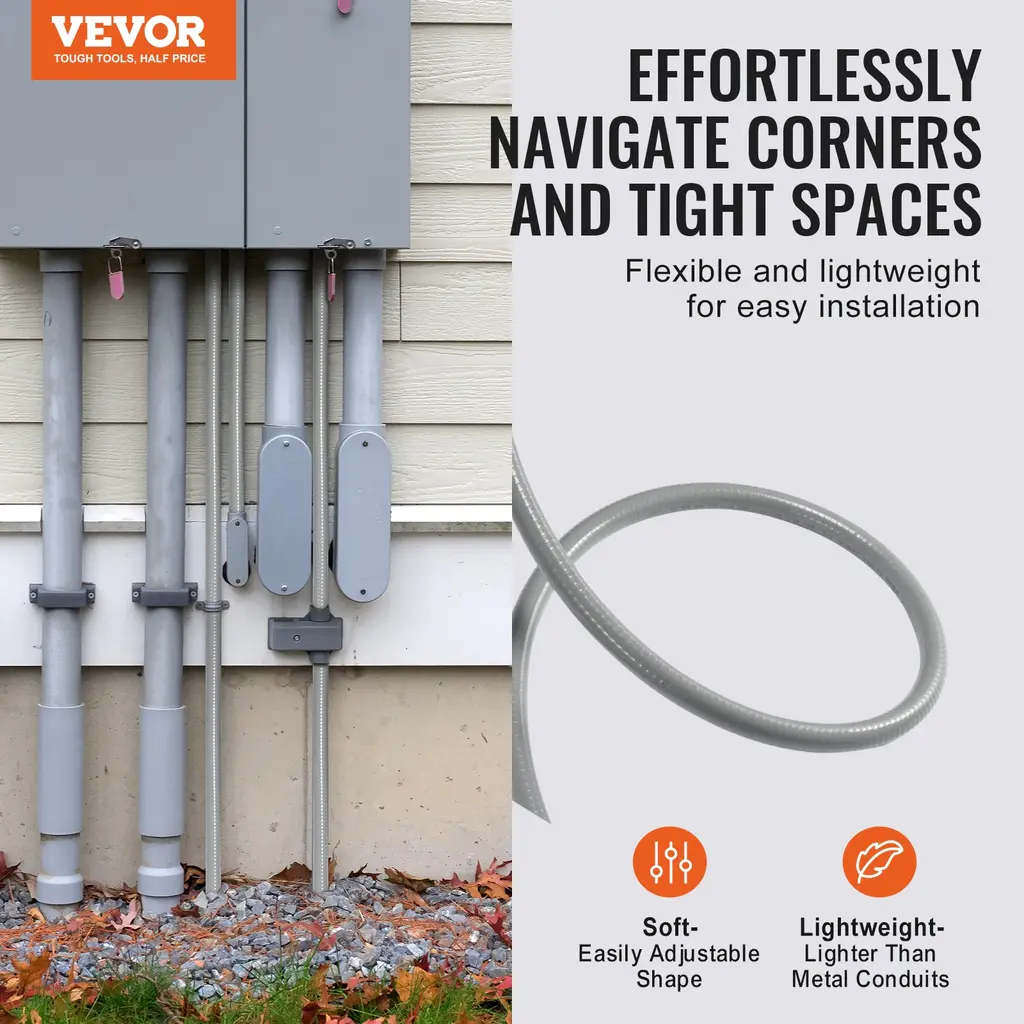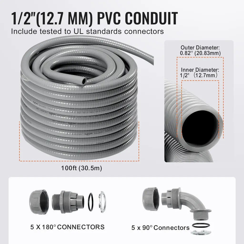 More Lightweight & Flexible: Our flexible electrical conduit features an inner diameter of 1 in (25.4 mm) and an outer diameter of 1.3 in (32.77 mm).Our flexible electrical conduit features an inner diameter of 1/2 in (12.7 mm) and an outer diameter of 0.82 in (20.83 mm).Our flexible electrical conduit features an inner diameter of 3/4 in (19.1 mm) and an outer diameter of 1.03 in (26.16 mm). Its lightweight design makes it significantly more manageable than metal conduits, allowing you to effortlessly route wires around corners, through walls, and across various surfaces. Evaluate the installation convenience with our PVC conduit. Cut to Fit, Quick Installation: Our PVC liquid-tight conduit allows you to complete your electrical installations efficiently. Easily cut the conduit to your desired length using just a utility knife or scissors—no additional tools are required. Enjoy a hassle-free, quick installation process with our user-friendly PVC conduit. Direct Sunlight & Burial Ready: Our flexible PVC liquid-tight conduit is equipped with corrosion resistance and IP65 rating, waterproof, dustproof, oil-resistant, and abrasion-resistant. It can handle exposure to acids, metal shavings, and other challenging environments, suitable for direct sunlight and burial applications. Experience flexibility in extreme hot and cold temperatures! Built to Last, Wide Application: With exceptional durability, tensile strength, and compression resistance, our flexible electric PVC conduit is perfect for HVAC systems, machine tools, marine equipment, motors and controllers, printing equipment, pumps, refrigeration units, transformer connections, outdoor lighting, and more. Trust our conduit to deliver reliable performance across diverse applications. Complete Accessories Included: Our 100-foot flexible electrical conduit comes with 5 x straight connectors and 5 x 90-degree connectors, ensuring adaptability for various applications. All components are tested to UL standards. To cater to different project needs, we offer three convenient sizes: 1/2" (12.7 mm), 3/4" (19.1 mm), and 1" (25.4 mm). Choose the perfect fit for your specific requirements! Package Content 5 x 180° Connectors 5 x 90° Connectors