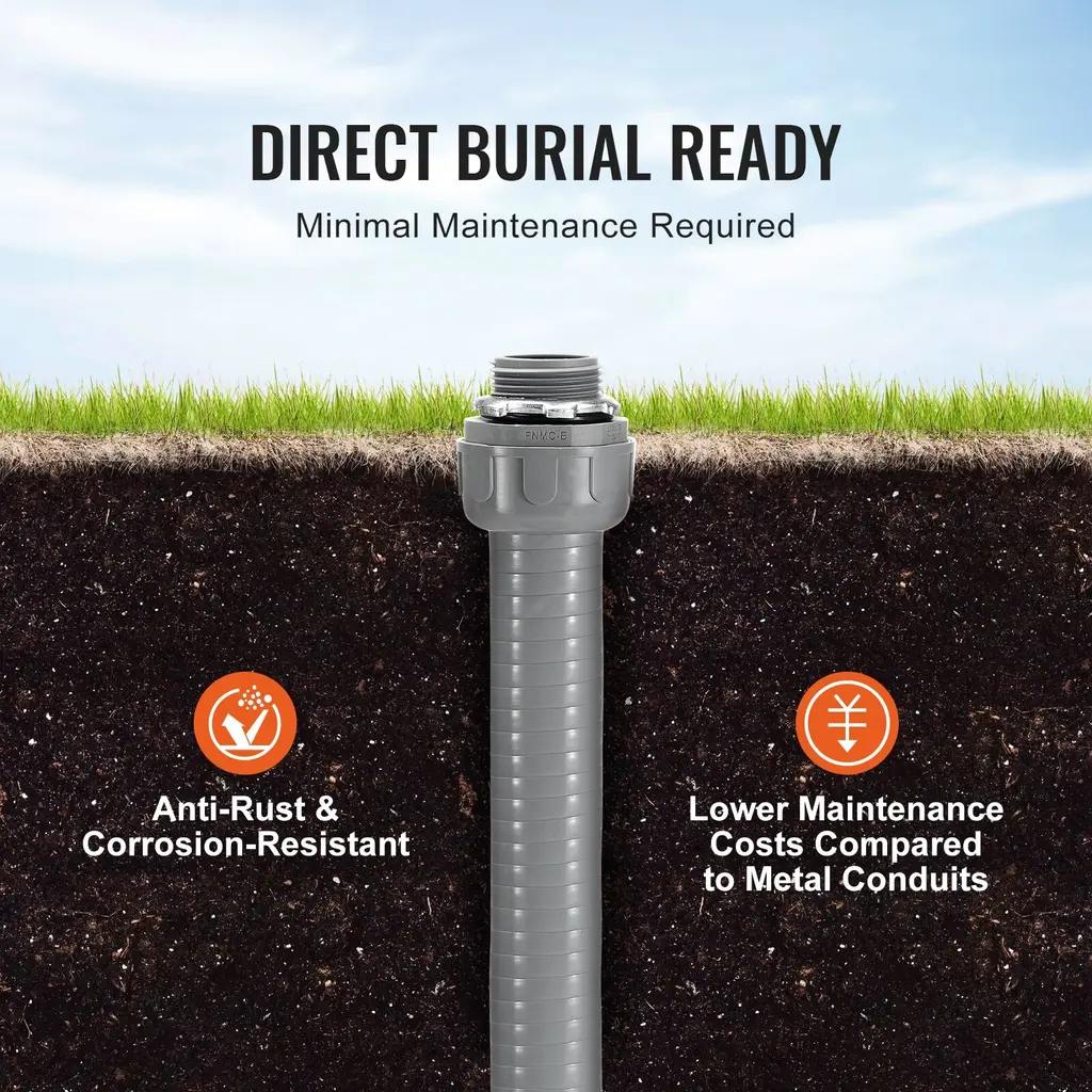 More Lightweight & Flexible: Our flexible electrical conduit features an inner diameter of 1 in (25.4 mm) and an outer diameter of 1.3 in (32.77 mm).Our flexible electrical conduit features an inner diameter of 1/2 in (12.7 mm) and an outer diameter of 0.82 in (20.83 mm).Our flexible electrical conduit features an inner diameter of 3/4 in (19.1 mm) and an outer diameter of 1.03 in (26.16 mm). Its lightweight design makes it significantly more manageable than metal conduits, allowing you to effortlessly route wires around corners, through walls, and across various surfaces. Evaluate the installation convenience with our PVC conduit. Cut to Fit, Quick Installation: Our PVC liquid-tight conduit allows you to complete your electrical installations efficiently. Easily cut the conduit to your desired length using just a utility knife or scissors—no additional tools are required. Enjoy a hassle-free, quick installation process with our user-friendly PVC conduit. Direct Sunlight & Burial Ready: Our flexible PVC liquid-tight conduit is equipped with corrosion resistance and IP65 rating, waterproof, dustproof, oil-resistant, and abrasion-resistant. It can handle exposure to acids, metal shavings, and other challenging environments, suitable for direct sunlight and burial applications. Experience flexibility in extreme hot and cold temperatures! Built to Last, Wide Application: With exceptional durability, tensile strength, and compression resistance, our flexible electric PVC conduit is perfect for HVAC systems, machine tools, marine equipment, motors and controllers, printing equipment, pumps, refrigeration units, transformer connections, outdoor lighting, and more. Trust our conduit to deliver reliable performance across diverse applications. Complete Accessories Included: Our 100-foot flexible electrical conduit comes with 5 x straight connectors and 5 x 90-degree connectors, ensuring adaptability for various applications. All components are tested to UL standards. To cater to different project needs, we offer three convenient sizes: 1/2" (12.7 mm), 3/4" (19.1 mm), and 1" (25.4 mm). Choose the perfect fit for your specific requirements! Package Content 5 x 180° Connectors 5 x 90° Connectors