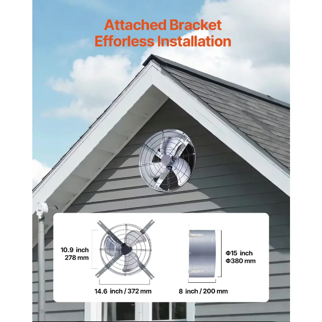 Feature: Efficient Ventilation: Our gable mount fan delivers an impressive 1300 CFM airflow, covering areas up to 1850 sq. ft.. It's the ideal choice for attics, workshops, and other spaces, effectively reducing temperatures and enhancing air quality with ease. Energy-Saving Design: Equipped with an adjustable thermostat, this gable attic fan automatically turns on and off based on ambient temperature, minimizing energy waste while promoting a green lifestyle. Durable & Long-Lasting: Built to endure, our gable vent fan features a high-strength steel housing that's proof to corrosion and aging. The aluminum alloy fan blades remain sturdy and unbent for long-term use. Enhanced Security Features: Designed with a robust protective mesh, this attic vent fan keeps out birds, leaves, and debris, ensuring secure operation and prolonging the lifespan of your ventilation system. Stay out of worry with our reliable security features! Installation Made Easy: This gable mount attic fan includes a 15-inch mounting bracket for easy setup. No professional tools are required—simply mount it to your wall and enjoy fresh, clean air effortlessly! Package Content: 1 x Gable Mount Fan 4 x Installation Brackets 8 x Self-Tapping Screws 1 x Thermostat