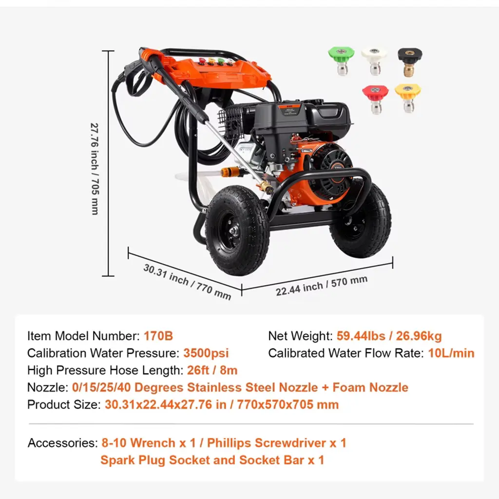 Feature: 3500 PSI High Pressure: The Gas Pressure Washer is a powerful washer with 3500 PSI and a flow rate of 10 L/min. It's perfect for removing stubborn stains, especially those on brick patios that have accumulated years of dirt and moss, as well as concrete driveways stained with oil or rust. If you don't have access to an electrical outlet, a gas pressure washer is the tool of choice. Efficient and Reliable Engine: This gas-powered pressure washer comes with a powerful 210cc 4-spoke engine that holds 0.8 gallons of gasoline. It is easy to start and comes with a 7-horsepower aluminum pump. If you are a DIY enthusiast who values strength and performance, then this washer is the perfect choice for you. Versatile Application: Our pressure washer comes with 5 quick-connect metal nozzles (0°/15°/25°/40°/soap nozzles) ranging from high-impact water jets to soft sprays. The absolute best for your different cleaning tasks and save unnecessary expenses. Unobstructed Travel: The cleaner is equipped with 10” tires on both sides of the bottom, which are wear-resistant and durable, and can be pushed and pulled without any obstruction, even on uneven surfaces. Easy to Move: Our gas power washer is made of sturdy steel frame with 26ft long wear-resistant high-pressure water hose, all the accessories are conveniently stored on the machine so you don't have to worry about losing any parts. Using this machine will make your cleaning tasks simpler and easier. Package Content Gas Pressure Washer x 1 Installation Kit x 1 Wrench x 1 Phillips Screwdriver x 1 Spark Plug Socket and Socket Bar x 1