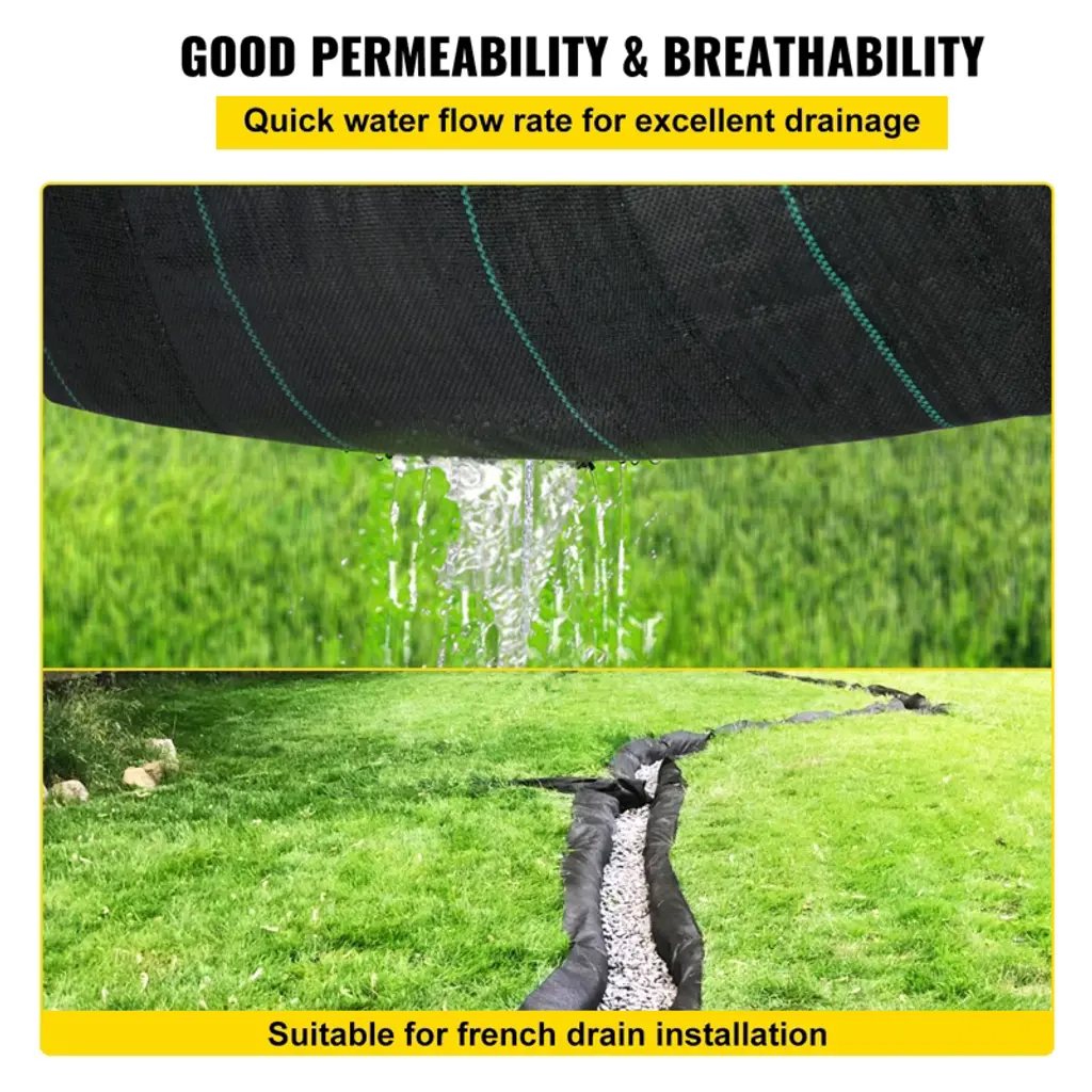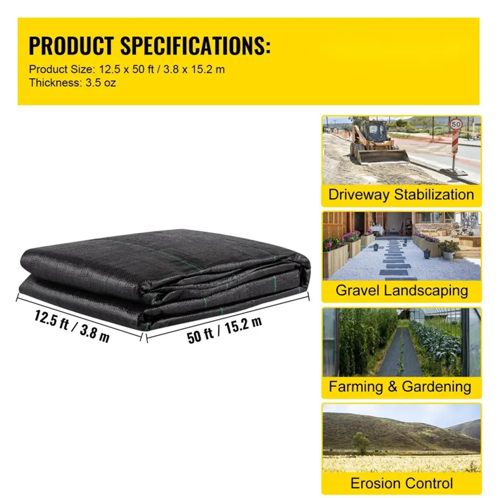 Feature: Large Geotextile Fabric: The geotextile driveway fabric has 625 Sq. Ft coverage area, length: 50 ft/15.2 m, width: 12.5 ft/3.8 m. According to your needs, it can be cut to function for driveway stabilization, gardening, agriculture, and drainage. Sturdy Woven PP Material: The 3.5oz ground fabric is made from thick woven PP material, sturdy, tear-proof, and corrosion-proof, which can serve you for a long time. 600 LBS Tensile Strength: The underlayment fabric is high-strength and stretchable with a large weight capacity. You can lay gravel, stones, big rocks on it to increase the stability and flatness of the road and prolong its service life. Excellent Water Permeability: The garden fabric is highly permeable and breathable, allowing water to flow quickly without worries about water pooling. It is ideal for french drains, garden planting, and landscaping. Wide Applications: The geotextile fabric is perfect for construction projects, such as road stabilization, riprap, retaining walls, animal stables, patio landscaping, etc. Package Content 1 x Geotextile Fabric