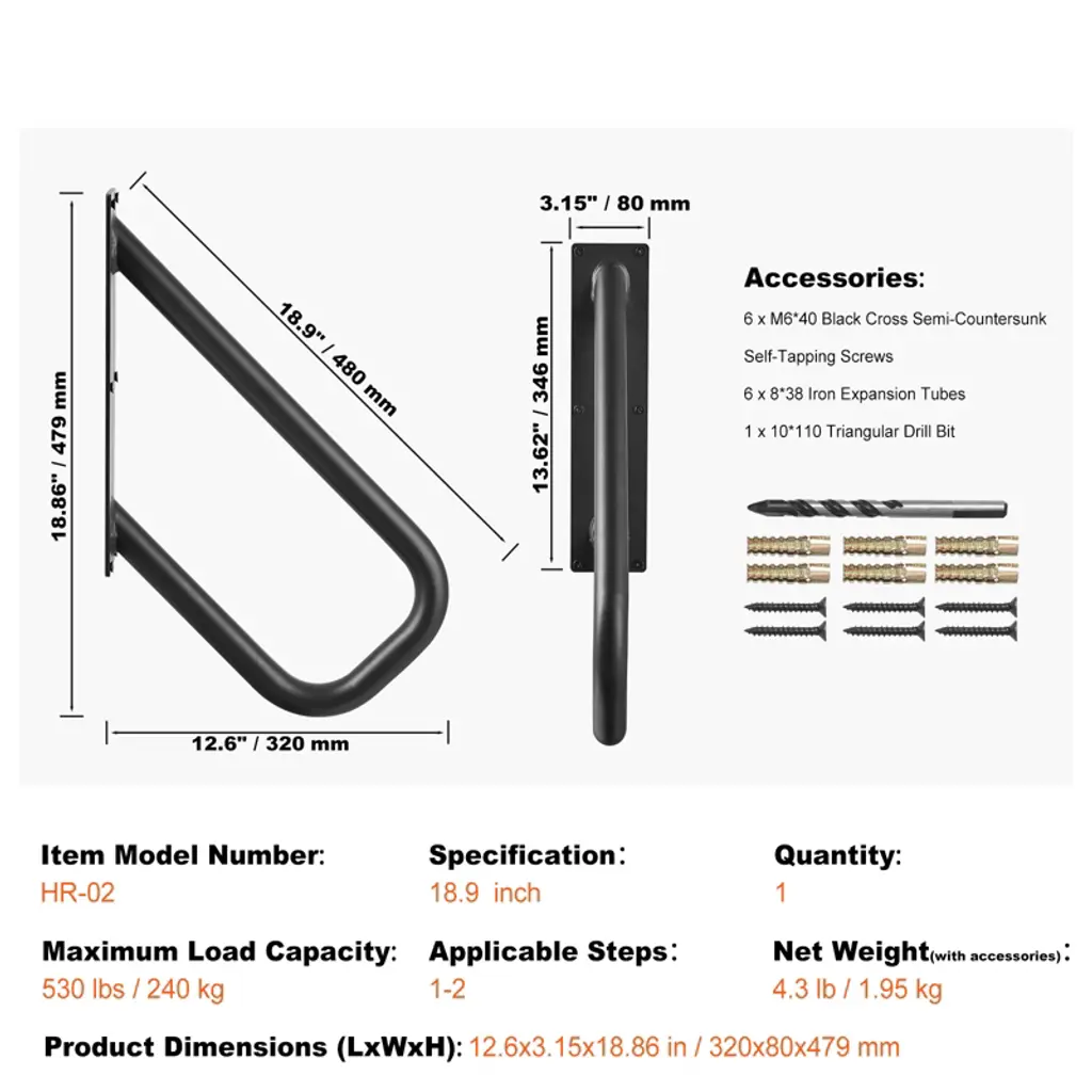 Feature: High-Quality Material: We understand the importance of safety in areas like stairs, hallways, or balconies for you and your family. Therefore, we ensure our handrails are made from high-hardness carbon steel, with fine welding for stability to prevent any potential accidents. The sandblasted surface is smooth, offering a more comfortable grip. 530 lbs Strong Load-Bearing: The wall-mounted handrail is durable and provides continuous safety protection for the elderly and children. Its burr-free surface is peel-resistant and can withstand sun, rain, and snow. The thickened handrail offers a comfortable grip, ensuring secure use for pregnant women and the elderly. Suitable for 1-2 Steps: This 18.9" wall-mounted handrail is perfect for 1-2 steps, with dimensions of 12.6 x 3.15 x 18.86 inches. It is ideal for most garages, gardens, hallways, and more, providing a secure and sturdy support for safe movement in these areas. Metal Expansion Tubes: To enhance the handrail's sturdiness, we use high-quality metal expansion tubes. Unlike plastic, they provide double reinforcement when paired with metal screws, fully supporting the weight of adults without wobbling or deforming, ensuring a longer service life. Wide Applications: The outdoor wall-mounted handrail can be installed on concrete, wood, tiles, marble, and other sturdy materials. Even when installed outdoors, it is resistant to rust, highly practical, and versatile for any location that needs installation. Package Content 1 x Handrail 6 x M6*40 Black Cross Semi-Countersunk Self-Tapping Screws 6 x 8*38 Iron Expansion Tubes 1 x 10*110 Triangular Drill Bit