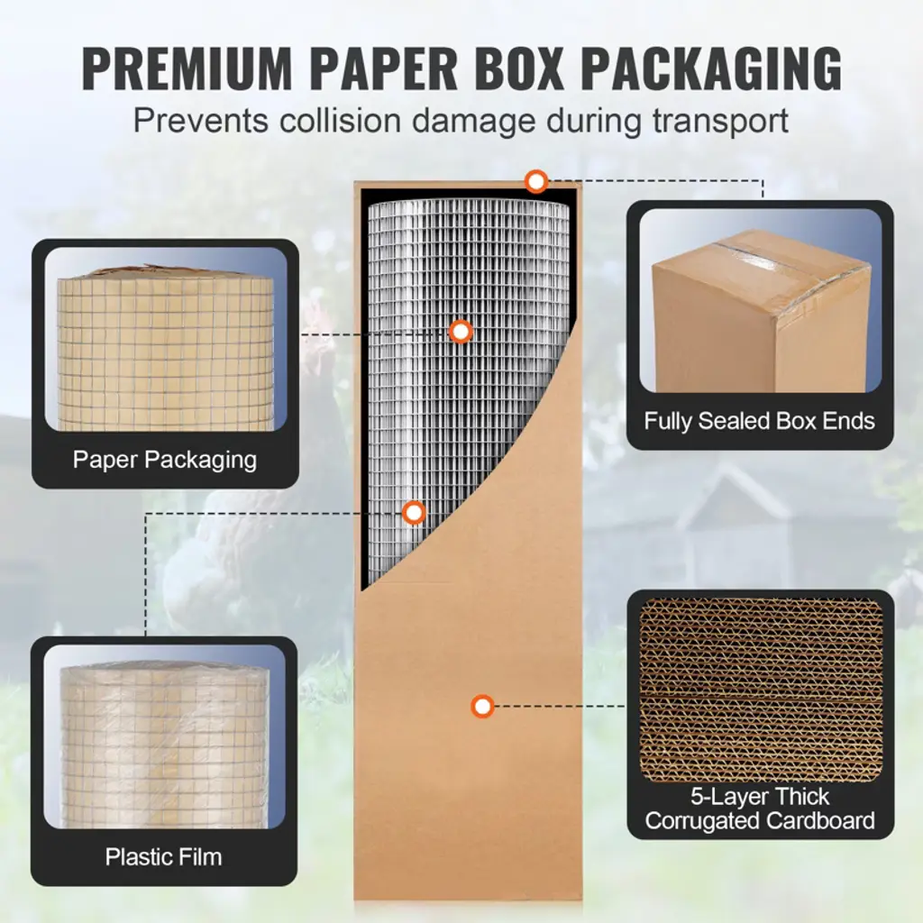 Feature: Heavy-Duty Hot-Dipped Galvanization: Our low-carbon steel hardware cloth undergoes professional hot-dipped galvanization for a uniform coating without bubbles. Pre-tested for salt spray, it ensures durable corrosion resistance, lasting through years of outdoor use without needing replacements. Robust Welded Structure: Our 24in x 50 ft hardware cloth is welded from low-carbon steel wire into a sturdy mesh structure, followed by a post-weld galvanization process. Each weld point is zinc-coated to prevent detachment, ensuring a bright, rust-proof finish even after prolonged exposure to different weather conditions. 1/2-inch Fine Mesh: Featuring narrow 1/2" mesh, even small animals find it difficult to penetrate. Perfect for safeguarding vegetable gardens from small rodents like squirrels, rabbits, raccoons, skunks, foxes, snakes, and more. Enhanced Packaging: To prevent damage during transportation, Our hardware cloth is packaged in five layers of cardboard boxes with fully covered sealing at both ends. Internally, it's wrapped with plastic film and paper, ensuring waterproof and rustproof protection. Minimize the risk of damage and ensure safe delivery! Easy to Cut and Use: Simply cut with scissors or wire cutters to create different shapes and sizes for chicken coops, garden beds, rabbit fences, hedges, drainage grid fences, flower beds, DIY projects, and more. Caution: Beware of sharp edges after cutting; always wear gloves when handling. Package Content: 1 x Roll of Hardware Cloth
