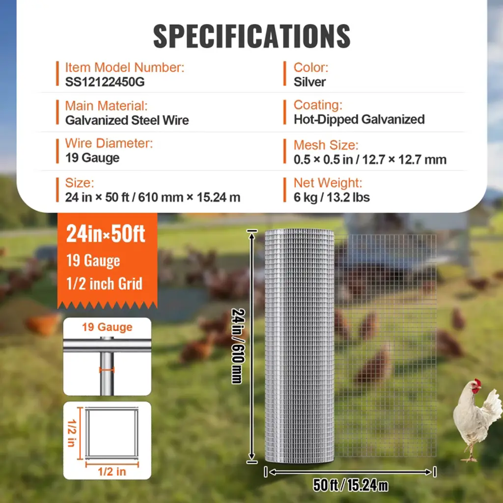 Vevor Hardware Cloth, 1/2 Inch 24in X 50 Ft 19 Gauge, Hot Dipped Galvanized Wire Mesh Roll, Chicken Wire Fencing, Wire Mesh For Rabbit Cages