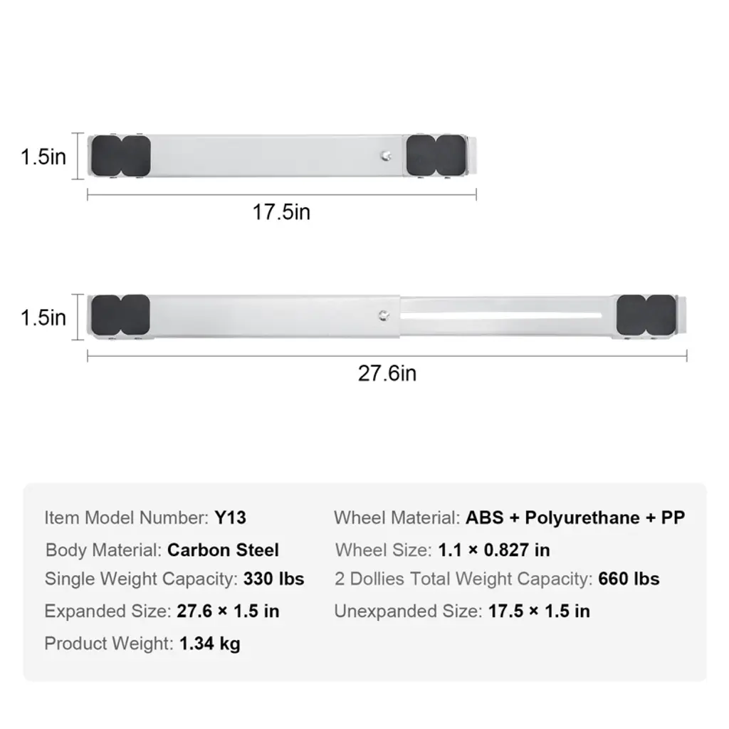 Feature: Adjustable Furniture Dolly: With our appliance roller's double-row design and simple structure, there's no need for complicated installations. It effortlessly extends from 17.5 inches to 27.6 inches, fitting perfectly under any furniture, from refrigerators and washing machines to dryers and more! Upgraded Large Wheels: Each mobile base set (2-pack) features 16 large polypropylene wheels, providing better load-bearing capacity and a smoother rolling experience. Say goodbye to struggling with heavy appliances and enjoy seamless movement with enhanced stability. Extend Appliance Lifespan: Tired of dealing with hard-to-move appliances or worrying about corrosion and water damage? Our washer stand raises your appliances by 1.5 inches, making cleaning and maintenance a breeze. It protects your appliances from damp floors, extending their lifespan and ensuring the security of your family. Non-Slip and Secure: Each appliance dolly is equipped with two non-slip pads, providing excellent traction and protection for your furniture. Plus, our dolly features a locking brake on one end, minimizing any risk of slipping or shaking. Experience the peace of mind that comes with a stable and secure washer stand. Strong and Reliable: We've used premium carbon steel to create a washing machine dolly that can handle your toughest tasks with a max load capacity of 660 lbs for 2 dollies. And when you're done using it, its compact design allows for easy storage in any corner of your room. Package Content: 2 x Furniture Dollies