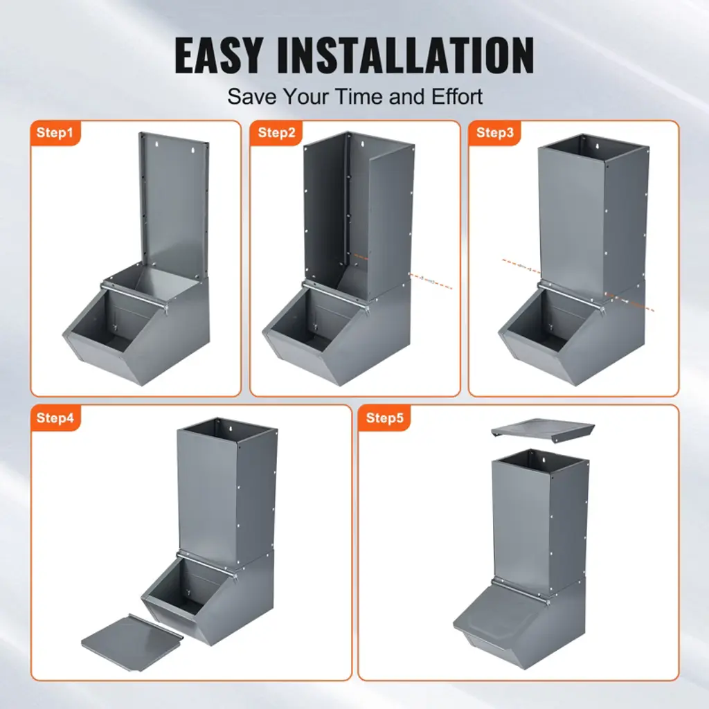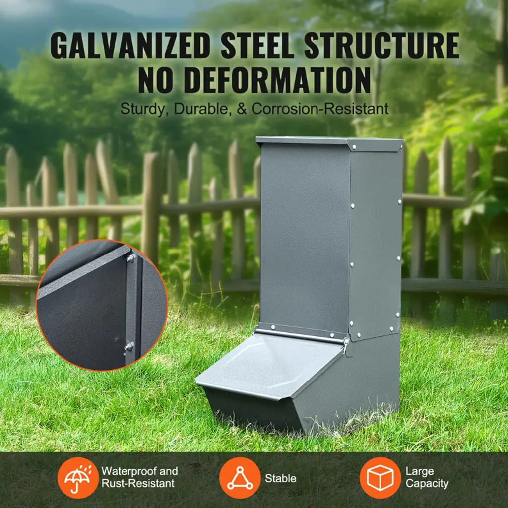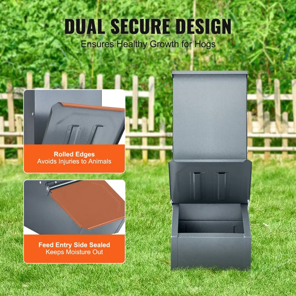 Feature: Galvanized Steel: Made from quality galvanized steel, the hog feeder is sturdy and durable. The rust and corrosion-resistant hog feeder adapts to harsh outdoor environments, ensuring long-lasting use. 2.2 Bushels Large Capacity: This pig feeder comes with 2.2 bushels capacity, that easily meet the daily feeding needs of 5 pigs, reducing the trouble of adding feed frequently for saving time and labor. Rolled Edge Security Design: The rolled edge design of hog feeder avoid scratching pigs while feeding, providing a more secure feeding experience and take care of every animal's security. Sturdy Structure: Our hog feeder comes with metal door that keeps feed dry and ensures pigs enjoy fresh food. Space-Saving Vertical Design: The livestock feeder measures 19.49" L x 11.81" W x 29.53" H, which makes full use of the small farm space and improves overall efficiency. Package Content 1 x User Manual