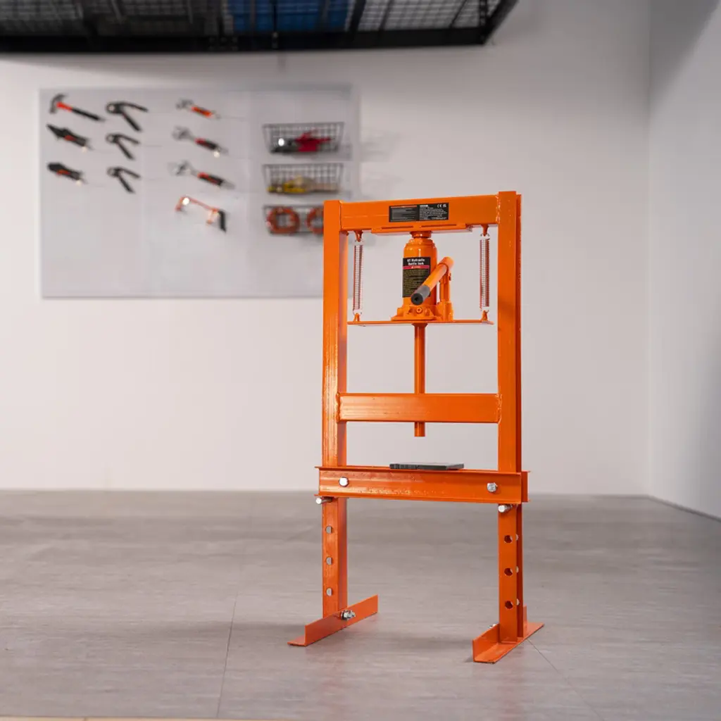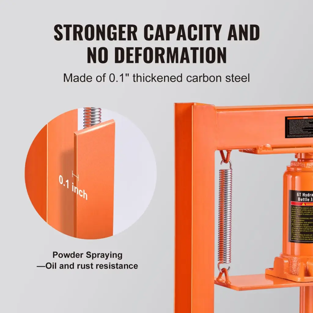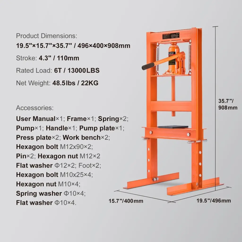 6-Ton Strong Loading Capacity: Whether you're a seasoned professional or a DIY enthusiast, our hydraulic shop press is the perfect tool for removing and installing automobile bushings, bearings, ball joints, U-joints, pulleys, gears, and more. This press can also be used for metalworking tasks like bending, straightening, and stamping. Get the job done quickly and easily. Relief Valve Mechanism: The hydraulic jack with a built-in relief valve is your perfect partner for heavy lifting tasks. With a clever design that ensures your security, this jack won't let you down when it counts. The relief valve kicks in automatically when the pressure exceeds 6T, avoiding any overpressure-related damage to the workbench. Heavy and Stable: The H-shaped frame structure provides a sturdy base that won't wobble or shake during use. Built to last, our hydraulic press boasts a robust 0.1-inch carbon steel body that can handle even the toughest jobs. And with a sleek powder-coated finish, the surface of the shop press is corrosion-resistant, and a breeze to clean. Adjust to Any Task: With a range of 2.2" to 9.8", you can easily find the perfect working height for a comfortable and efficient experience. And adjusting the height is a breeze thanks to the convenient pin system. Plus, our hydraulic bushing press comes with two movable stamping plates that are perfect for securing small parts during use. More Helpful Details: Your security and satisfaction are our top priorities! Our hydraulic press machine is certified by DOC international, providing peace of mind during use. Plus, we've reinforced our carton packaging to minimize any loss or damage to the components during shipping. Package Content: 1 x Frame 2 x Springs 1 x Pump 1 x Handle 1 x Pump Plate 2 x Press Plate 2 x Work Bench 2 x M12 x 90 Hexagon Bolt 2 x Pin 2 x M12 Hexagon Nut 2 x Φ12 Flat Washer 2 x Foot 4 x M10 x 25 Hexagon Bolt 4 x M10 Hexagon Nut 4 x Φ10 Spring Washer 4 x Φ10 Flat Washer 1 x User Manual