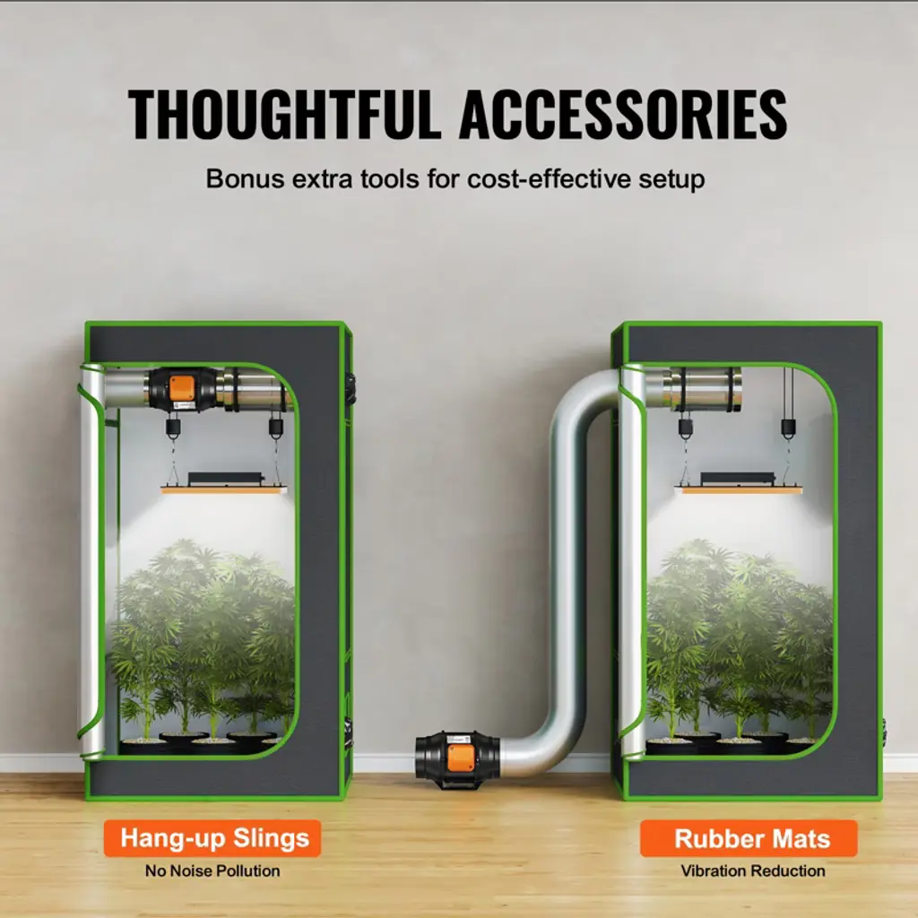 Feature: Universal Applications: Take a deep breath and relax. Our inline duct fan is specially designed as an exhaust for heat, humidity, and smoke, improving airflow in air planting tents, hydroponic planting rooms, electronic equipment rooms, kitchens, basements, etc. Get ready to go with the flow. Blow Your Worries Away: Our inline fan provides a sufficient airflow of 400 cfm, enough to handle wide areas of ventilation and dehumidification, maintaining clean and fresh air circulation in dry environments all the time. Take control of any environment confidentially. Power in Silence: Are you tired of loud, obnoxious ducts? Well, get ready to work in silence! Our inline exhaust fan is equipped with a high-quality AC motor that ensures strong power at a low noise of 34 dB, which will not disturb your work and life. At the same time, the motor saves 30% on energy consumption, extending its service life. Control you can Feel: Do you want to get various airflow speeds at any time to achieve better ventilation effects while still being in control? Our inline air duct fan can be controlled via the manual knobs. You can adjust the speed to meet the ventilation needs of different environments. What are you waiting for? Go with the flow! Everything You Need: To save time and cut costs dramatically, we provide a 6-inch inline fan with hang-up slings and non-vibration rubber mats and straps, so you can finish the installation quickly! You are in control! Choose between hanging it or mounting it on the wall. Package Content 1 x Inline Duct Fan 4 x Rubber Mat 1 x Hang-up Sling 4 x Self-tapping Screw 1 x User Manual