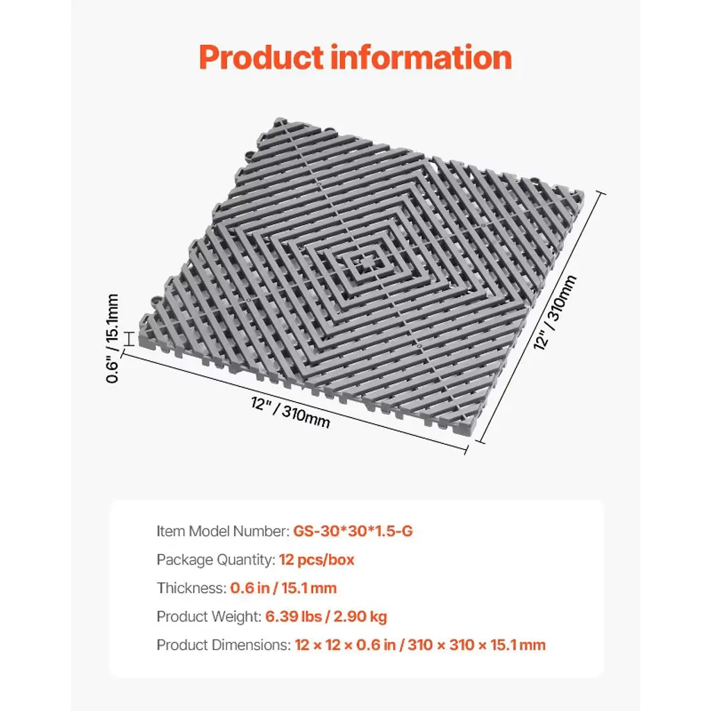 Feature: High-Strength PP: This drainage mat is made from durable PP material, making it ideal for garages where it withstands frequent vehicle traffic without losing shape. Compared to traditional hard plastics, PP offers added durability, ensuring stability under heavy loads and extending its lifespan. Extra-Thick Design: Our interlocking drainage mat features an upgraded 15 mm thickness, boosting drainage efficiency. It rapidly clears garage water buildup while effectively supporting vehicle weight. Its solid structure offers outstanding load-bearing performance, which is ideal for high-traffic garage areas. Interlocking System: Designed for easy installation, this modular interlocking cushion snaps together securely with its unique interlocking system. You won’t need complex tools, and setup is a breeze, saving time and effort. Customizable Layout: This drainage floor mat allows for creative customization! Mix and match different colors to create a unique DIY design, adding a personal touch to your garage or workspace. Versatile Security: Our drainage floor tile is versatile enough for use in car repair shops, garages, gardens, and other wet environments, providing reliable anti-slip drainage security wherever needed. Package Content 12 x Pieces of Drainage Mat