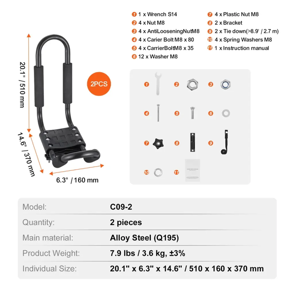Feature: Transport A Set Of Paddleboards: This roof kayak carrier can be used to put a kayak on one side, use it and transport the kayak easily. It makes it more convenient and easy for you to enjoy your vacation. Stabilizing J-Shape Design: The J-shape kayak carrier is designed at an angle of about 45°, which is highly compatible and allows most different styles and shapes of kayaks to fit as tightly as possible on the carrier, together with our extra-long greater than 8.9' / 2.7 m strap with compression buckles for securing, the kayak stays stable during transportation. Easy To Install Universal Roof Rack: This rack needs to be mounted on the roof beam or roof bars, and it is compatible with most of the roof bars on the market, round bars Φ1.0" - 1.6" / Φ25 - 40 mm, flat bars 0.6" - 1.6" / 15 - 40 mm thick, and the width of the bar rack <3.9" / 100 mm can be mounted. It is easy to install by tightening the screws at the bottom to fix it to the top bar. Strong & Heavy Duty: Our racks are made of high-strength thick alloy steel and high-quality plastics, the whole set of racks can withstand a dynamic load of 150 lbs / 68.0 kg, which makes it easy to load a large kayak without deformation or damage. In addition, our racks are added with rust-resistant coating for a long service life in the wind and rain. Note: Please check the load capacity of your car roof and crossbar rack when using to avoid crushing the roof. Reduce Scratches: Wear-resistant plastic small brackets as well as thick oversized soft cushions attached to each bar effectively prevent kayak rubbing and damage, and provide full protection for the crossbars and kayak roof rack. Package Content 1 x Open End Wrench 14 4 x M8 Common Nuts 4 x M8 jam nuts 4 x Round head square neck screws (carriage bolts) M8x80 4 x Round head square neck screws (carriage bolts) M8x35 12 x M8 flat washers 4 x Plum hand nuts 2 x small brackets 2 x Tie-down straps with press-studs (>8.9' / 2.7 m) 4 x M8 spring washers 1 x Instruction manual
