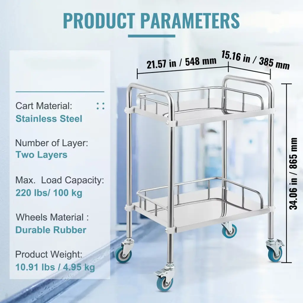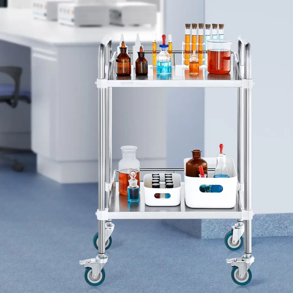Feature: Sturdy 2-Tier Design: Our laboratory cart with two shelves offers ample space for medical and lab equipment. Measuring 21.57"x15.16"x34.06", it provides generous room between shelves for accommodating large items. Featuring built-in guardrails, it ensures items remain secure during transport. Durable Stainless Steel: Built with solid stainless steel, this lab trolley can support up to 220 lbs of equipment and supplies. Its rust-resistant surface ensures easy cleaning, making it perfect for lab environments. Effortless Mobility: Equipped with four universal wheels and silent casters, this rolling cart moves smoothly even when fully loaded. Two locking casters provide stability on uneven surfaces. The wide handle ensures a comfortable grip for easy maneuvering. Versatile Applications: This serving cart is ideal for storing medical tools or beauty supplies and finds widespread use in hospitals, beauty salons, clinics, spas, tattoo studios, and pet shops. Quick Assembly: The lab cart is really convenient for daily use. Minimal effort for assembly is all it takes, making it easy to construct this utility cart in 10 minutes. Focus on your next big project sooner with our quick installation. Package Content 1 x Lab Medical Cart