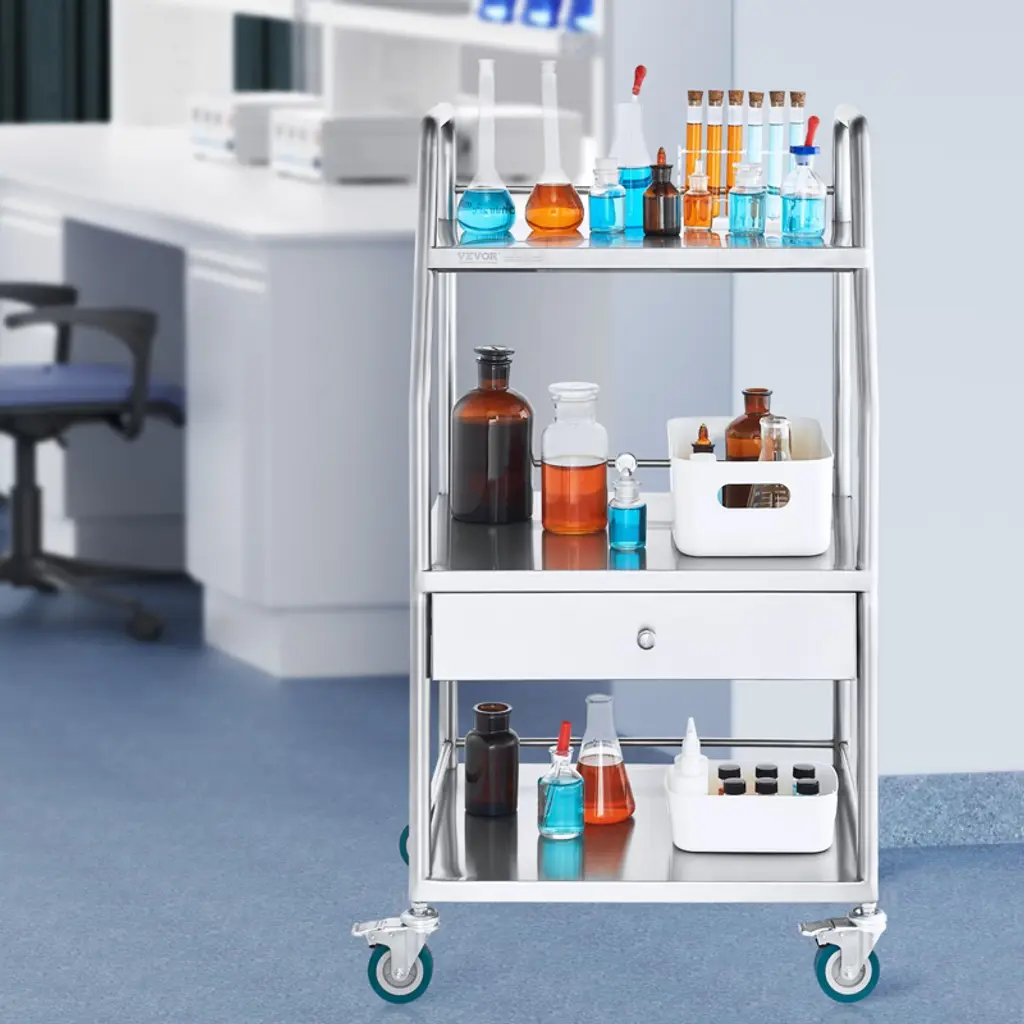 Vevor Lab Serving Cart, 3 Layers Stainless Steel Utility Rolling Cart, Medical Cart With A Drawer, Dental Utility Cart With Lockable Wheels