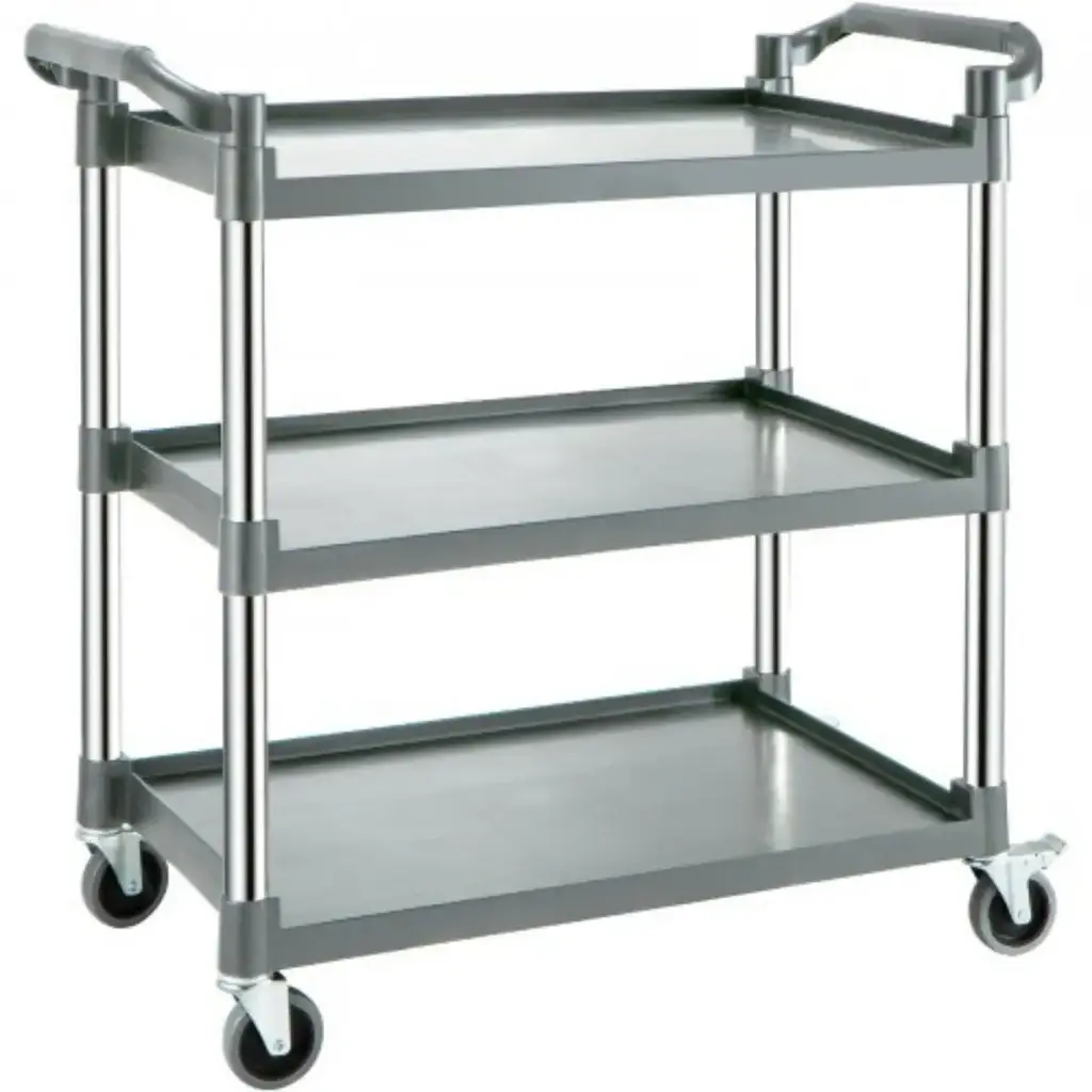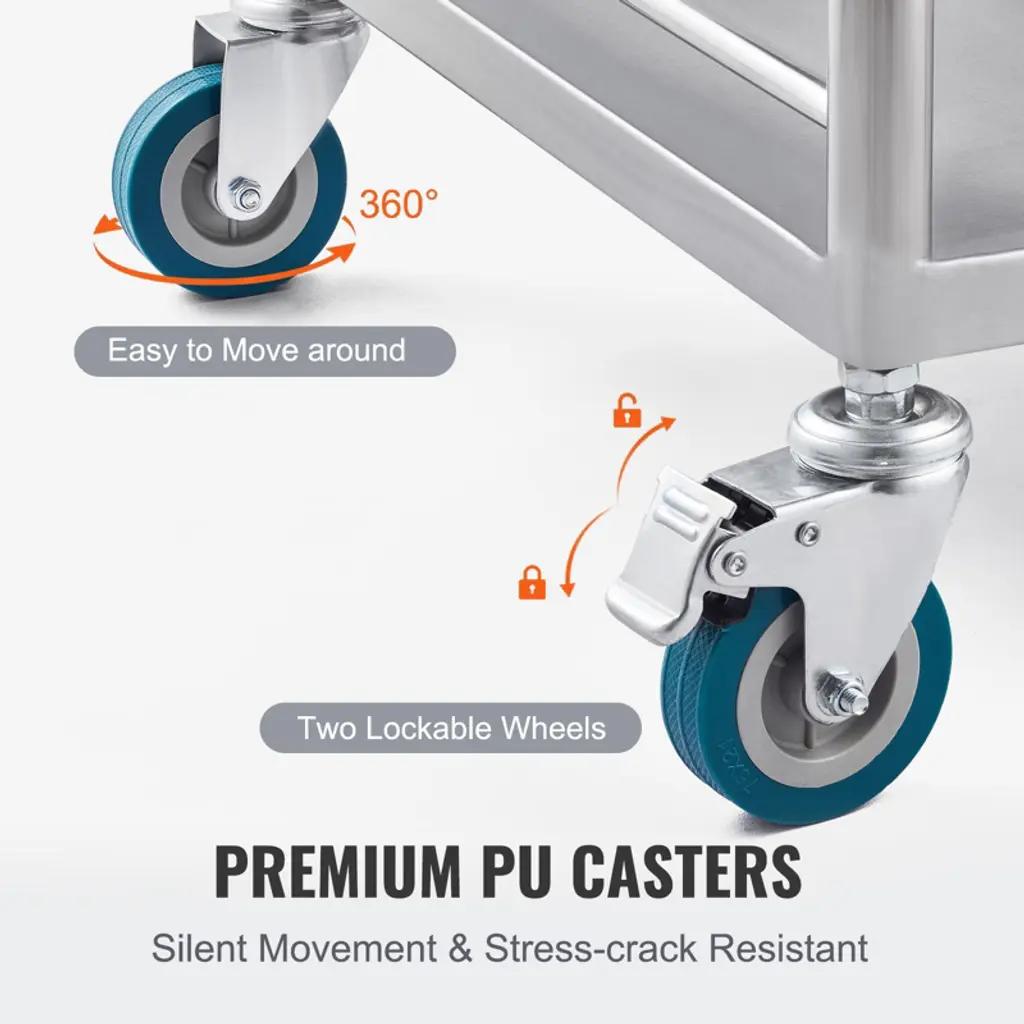 Feature: 3 Shelves Design: The three shelves design allows for super easy storage of supplies, provides easy and systematized access to the items, and enough space to accommodate laboratory equipment. Premium Steel Construction: With a solid steel structure, this lab trolley supports up to 220 lbs, and accommodates lab equipment, items, and other supplies. The stainless steel surface is easy to clean and not easy to rust. Four Universal Wheels: Equipped with four 360° wheels, including two with foot brakes, this rolling cart allows easy transportation of tools or items. Say goodbye to the hassle of moving heavy objects. Cart with One Drawer: Features one large stainless steel drawer, which is effortless to store items. In addition, the drawer is large enough for lab accessories, measuring 18.39" L x 11.14" W and sliding smoothly. Diverse Application: This lab serving cart provides a perfect solution for storing lab equipment and other supplies, widely applied in laboratories, schools, universities, salons, and so on. Package Content 1 x Lab Medical Cart
