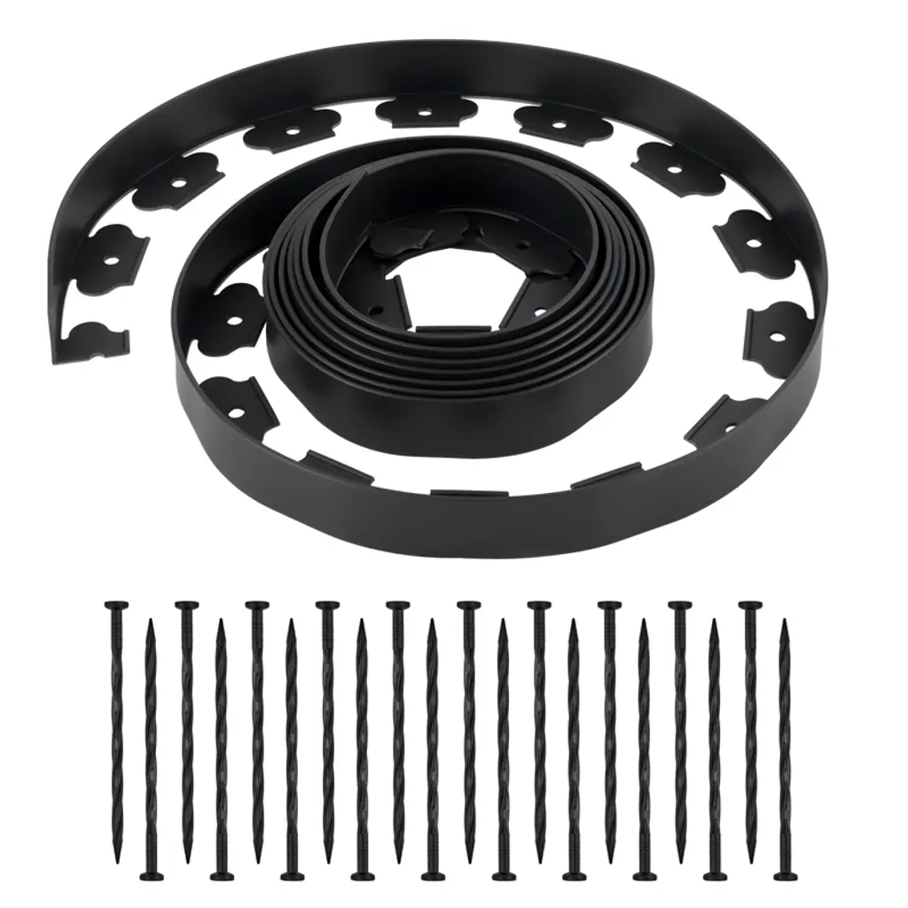 Feature: 66 ft x 4 in Garden Edging: This 66 ft flexible plastic garden edging is ideal for large yards, garden beds, and extended landscape borders. The 4 in raised height helps block invasive grass roots and keeps edges clean and defined. Easy to Set up: Lay the lawn edging along the garden edge and use a hammer to drive the included spikes through the holes. Ground stakes reinforce the joints for lasting stability—no trenching or concrete required. Flexible for Curves & Contours: Our plastic landscape edging can be straightened or bent to follow curved beds, tree rings, or uneven terrain. Cut to your desired length as needed. Durable & Weather-Resistant: Made from high-strength PE with UV and temperature resistance, the flower bed edging won't crack, fade, or lose shape, even with long-term outdoor use. Complete Accessory Kit: Our garden edging boarder ncludes 60 pcs of 8 in (200 mm) spikes and 2 extra 9.4 in (240 mm) ground stakes for secure anchoring. For optimal performance, install in moist, soft soil. Package Content 1 x Landscape Edging 60 × Ground Stakes 2 × Ground Pegs 1 × Small Hammer 1 × Instruction Manual