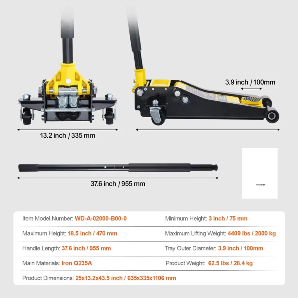Feature: 2T Maximum Capacity: Our floor jack can easily lift up to 2 tons / 4409 lbs, making it suitable for sports cars, family sedans, light pickups, and SUVs. It’s perfect for tasks such as tire changes, brake system inspections/repairs, exhaust system replacements, suspension maintenance, and other chassis-related work. Whether you're a professional mechanic or a DIY car enthusiast, lifting your vehicle is effortless. Low Lifting Height: The minimum lifting height is 3.2 inches / 80 mm, and the maximum lifting height is 14.6 inches / 370 mm. Its low clearance allows low profile floor jack to slide under lower vehicles while providing enough height to lift the vehicle off the ground. To lower the vehicle, simply rotate the jack handle counterclockwise. Quick and Effortless: The high-performance low-profile car jack features a unique dual parallel pump system, which lifts most vehicles with just 3-1/2 pumps. It includes a reliable safety release valve that activates in case of overload to prevent damage or injury. The cylinder is sturdy and sealed to minimize oil leaks. Sturdy Aluminum-Iron Construction: Featuring a welded frame design, the small floor jack remains stable during use. It combines the stability of iron with the lightweight properties of aluminum, reducing wobbling, deformation, and corrosion, making it easy to carry and use. The handle, made of carbon structural steel, is reinforced and thickened to prevent breakage during lifting. Convenient Design: Thanks to the lever principle, the long handle makes lifting easier. The two-piece design allows the handle to be disassembled for compact storage. The rotating rubber saddle can be easily adjusted and aligned with support points during use, providing additional protection for the vehicle. The wheels at the base make the jack easy to move and maneuver, while the side handles make lifting the jack more convenient. Package Content 1 x Floor Jack 1 x Set of Accessories
