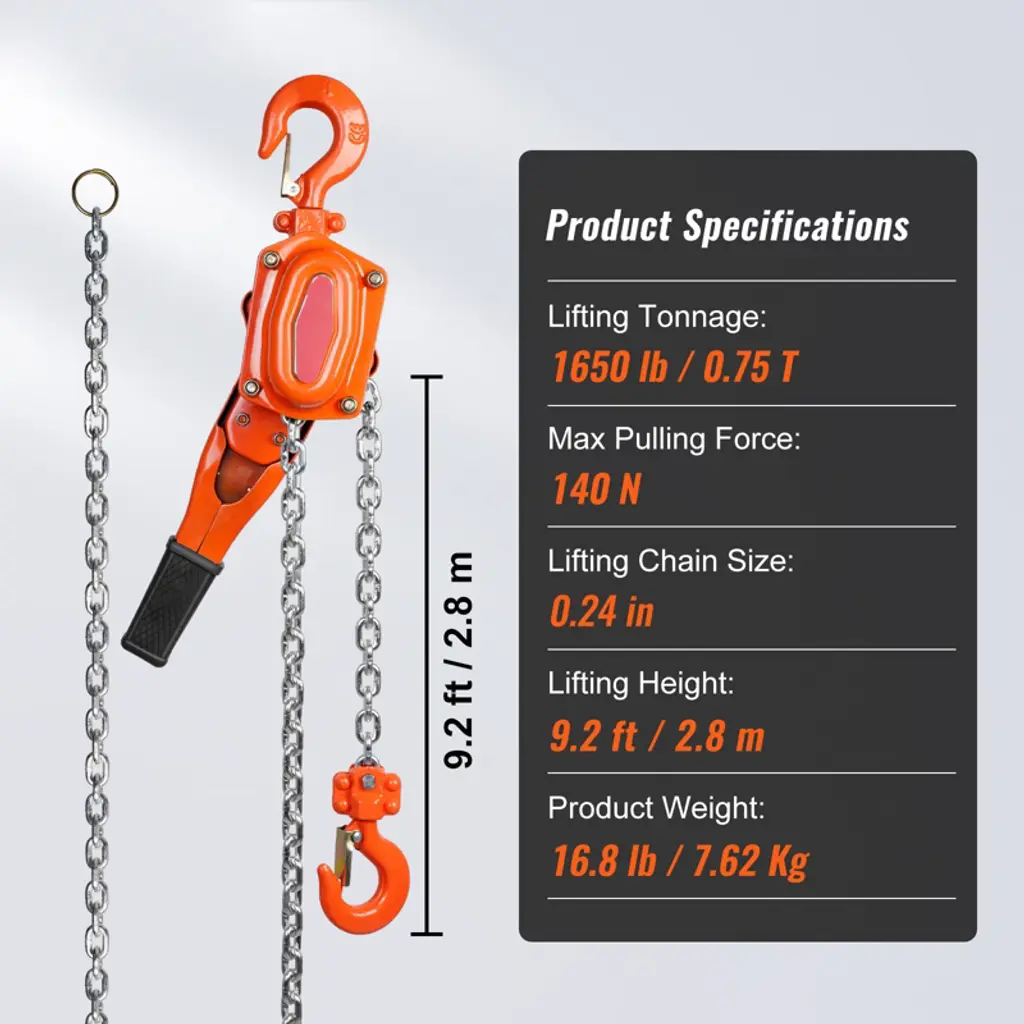 Vevor Manual Lever Chain Hoist, 3/4 Ton 1650 Lbs Capacity 10 Ft Come Along, G80 Galvanized Carbon Steel With Weston Double-pawl Brake