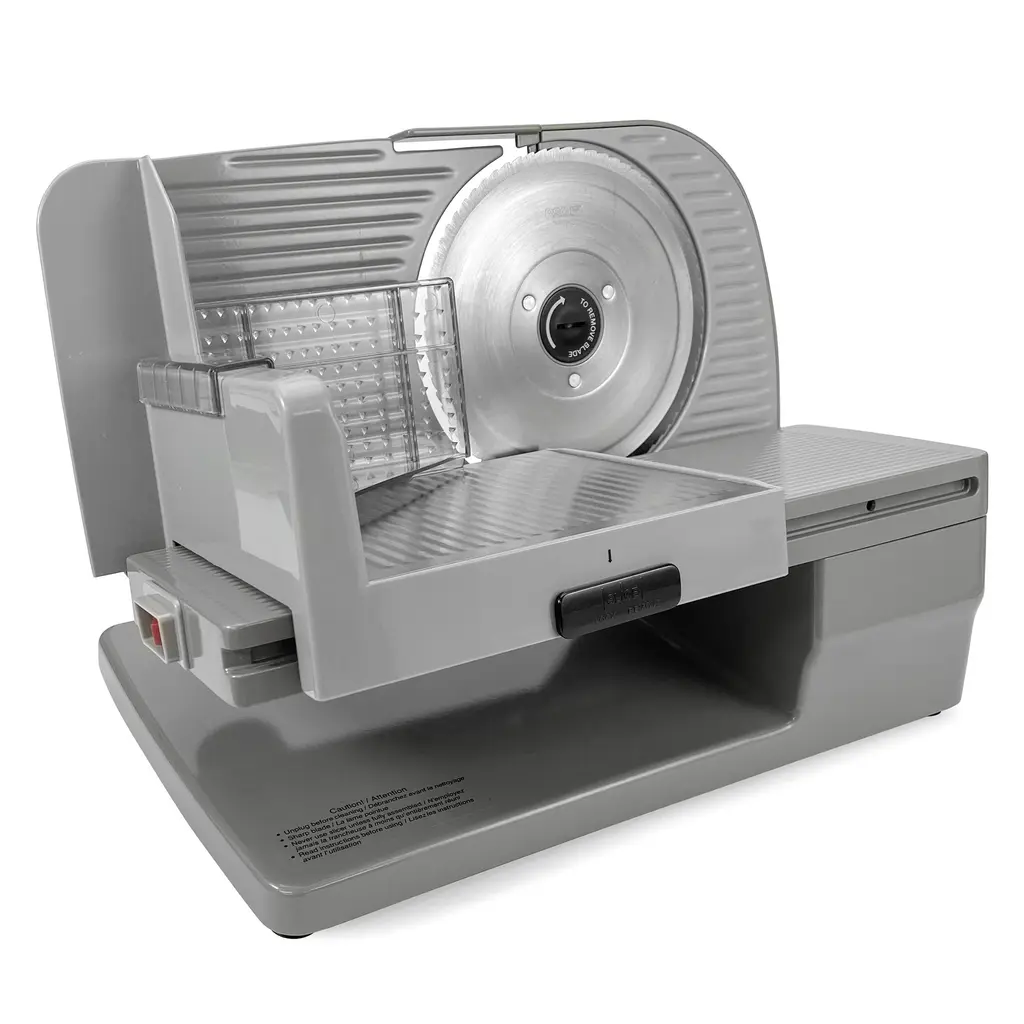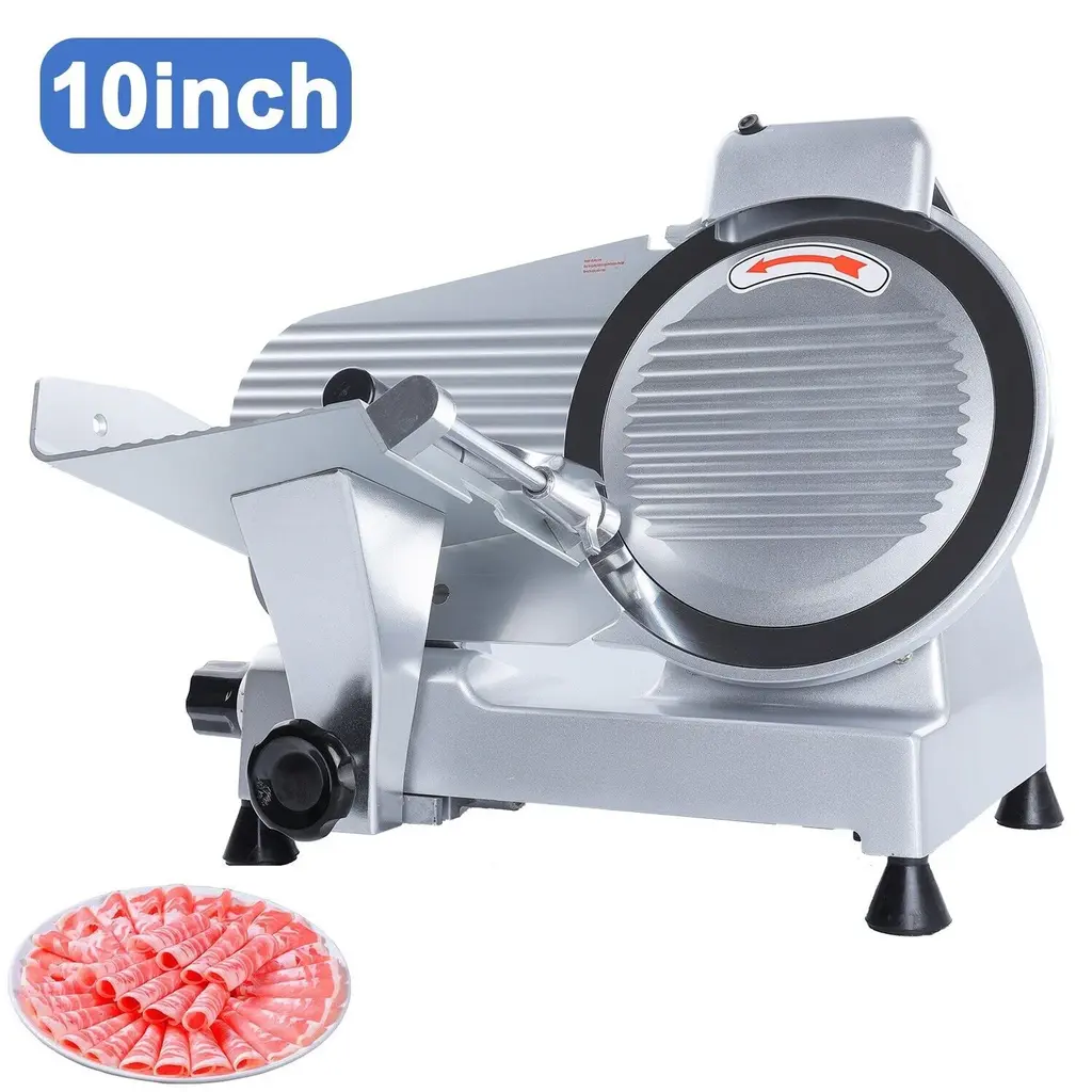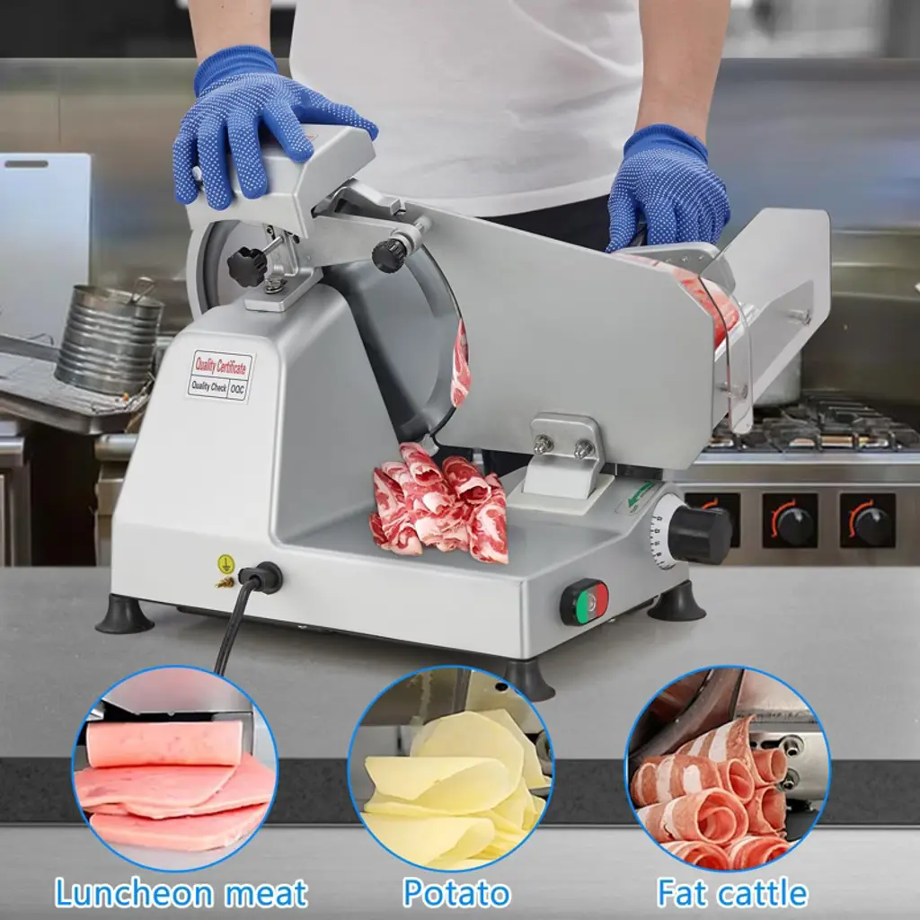 Upgraded SUS420 Blade: Our meat slicer is equipped with an upgraded 7.5" wide SUS420 stainless steel blade, effortlessly handling various food textures such as frozen meat, cheese, raw meat, cooked meat, ham, and bread. Quick Slicing: Powered by a 180W motor running at 80-120 rpm, coupled with sharp blades, our electric food slicer allows you to quickly slice through a variety of ingredients, significantly enhancing your work efficiency. Adjustable Thickness: The deli meat slicer features a thickness adjustment knob with a range from 0-15mm (0 - 0.6 inches). You can easily customize the thickness to meet your preparation needs, perfect for making hamburgers, sandwiches, cold cuts, fruit platters, and more. Easy to Clean: All parts of the electric meat slicer in contact with food are made of food-grade materials. The stainless steel tray can be easily cleaned with a cloth after slicing, and the blades, food holder, and food pusher are removable, ensuring thorough cleaning and hygiene for your subsequent slicing tasks. Stability and Safety: Our frozen meat slicer includes a raised food pusher with protruding spikes and non-slip feet, ensuring stable and smooth meat slicing. The food pusher effectively protects your safety while working. Package Content 1 x Meat Slicer 1 x Pressure Plate 1 x Cleaning Brush 1 x User Manual