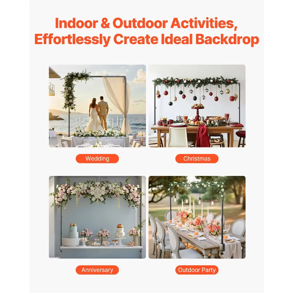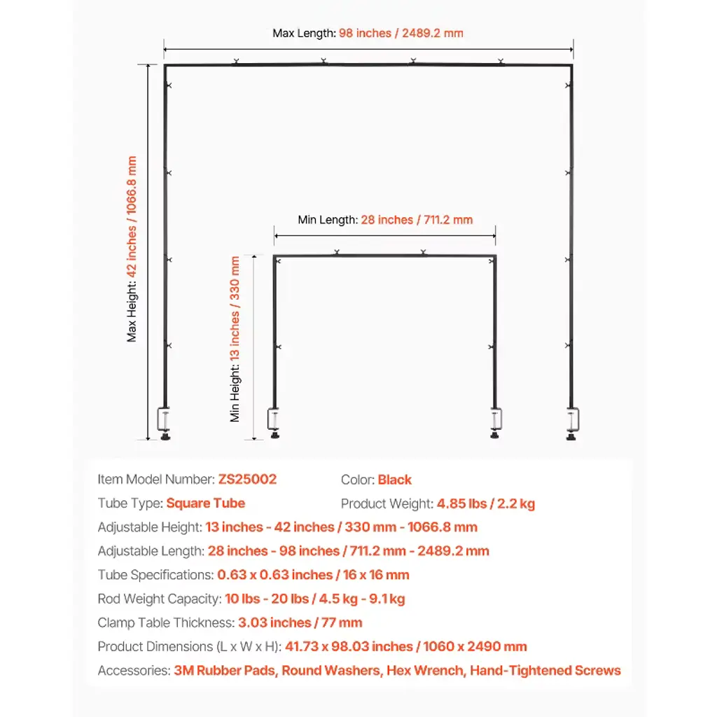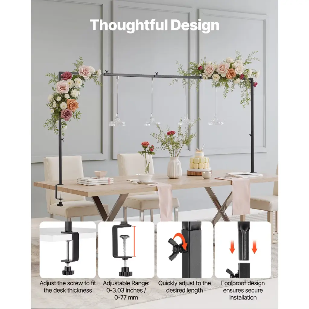 Feature: Sturdy Weight-Bearing Design: Built with square metal tubes and 3.03 in / 77 mm C-clamps, this over the table rod stand offers 10-20 lbs (4.5 kg - 9.1 kg) load capacity, making it more durable and stable than ordinary thin round pipes. The rust-resistant powder-coated surface withstands outdoor weather. Adjustable Multi-Size Design: The table balloon arch frame offers 3 adjustable height (13 in, 28 in, 42 in), with lengths between 28 in (711.2 mm) to 98 in (2489.2 mm), fitting 4FT, 6FT, and 8FT tables. The clamp can securely hold tables up to 3 inches thick, providing precise support for various activities. Easy Installation: The table arch frame with square pipe insert structure and hand-tightened screw design offer a simple, stable setup without wobbling, ensuring fool-proof assembly. It's more efficient than traditional threaded connections and wrench installations. Versatile Use and Flexible Setup: Portable and easy to move, this table arch stand is ideal for both indoor and outdoor use. Ideal for weddings, celebrations, birthday parties, New Year’s, Halloween, Thanksgiving, Christmas, candy buffets, and graduations, meeting all your decoration needs. Storage Bag for Easy Transport: The tabletop rod frame includes square tubes (2 L-tubes, 1 square tube, 8 C-tube pipes, 2 C-shaped pipes), 3M rubber pads, round pads, an Allen wrench, hand-tightened screws, and a storage bag, ensuring convenient storage and transport. Protect your stand from scratches and keep it like new for future use. Package Content 3M Rubber Pads Round Washers Hex Wrench Hand-Tightened Screws