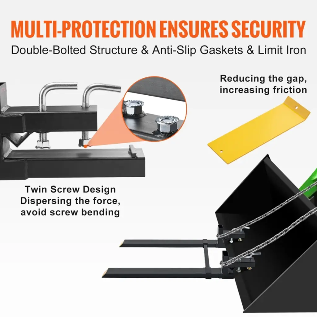 VEVOR Pallet Forks, 2000 lbs Clamp on Pallet Forks, 43" Total Length Heavy Duty Pallet Forks with Adjustable Stabilizer bar, Tractor Bucket Forks for Tractor Attachments, Skid Steer, Loader Bucket Description: 4000 LBS Capacity: Made from durable square steel tubing, these pallet forks can easily handle your everyday needs without bending or breaking under pressure. Reinforced Bolts & Screws: With reinforced bolts and grooved screw heads, our clamp on pallet fork is built to last. Adjustable Stabilizer Bar: The stabilizer bar can be adjusted between 19.5" and 36”. You'll never have to worry about heavy loads causing your forks to separate. Stay safe while getting your farming and gardening tasks done. Easy Installation & Versatile: Our tractor fork is designed to handle a variety of tasks. Simply slide the fork over the cutting edge of your bucket and clamp it down to lock it in place. You can use it to move logs, wood, and firewood, transport fence posts and hay bales, clear debris and bushes, and more. Product Dimensions: This pallet fork for tractor and bucket measures 60" overall length, with a 43" fork blade. The blade has a height of 2" and a width of 2.75". The gap between the lip of the bucket and the blade is 2.95". The adjustable range of the stabilizer bar is 19.5" to 36 "W. Each package contains 1 x fork, 1 x stabilizer bar, and 1 x user manual. Package Content: 1 x Pallet Fork 1 x Manual
