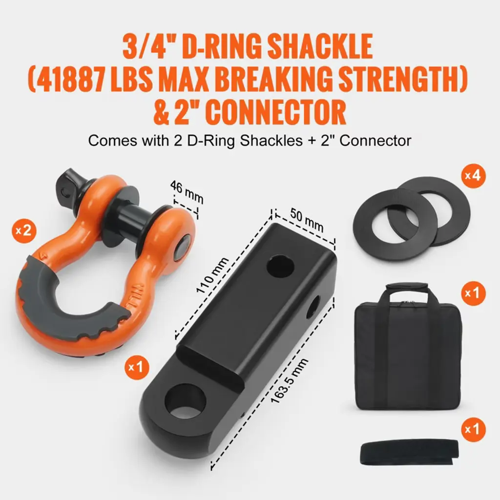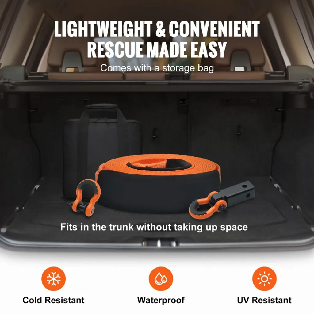 Feature: Heavy-Duty Tow Strap Kit: With an impressive 36,000 lbs breaking strength, our tow strap is perfect for towing trucks, off-road vehicles, and heavy equipment. At 30 feet long and 3 inches wide, it's your go-to for tackling any rugged terrain or emergency situation. It comes with everything you need: a tow strap, a connector, two 3/4" D-ring shackles, and a storage bag. D-Ring Shackles: Get peace of mind with our tow rope's ultra-safe D-ring shackles. They're zinc-plated for durability and come with silicone bumper guards. Lab-tested and certified to handle up to 41,887 lbs – now that's some serious strength you can rely on! Upgraded Details: Our recovery strap is all about toughness! With advanced surface treatment, it's super durable and waterproof, ready to tackle any rough conditions. Plus, the added protective sleeves at both ends reduce wear and tear, boosting lifespan and making it safer and comfier to handle. Convenient Storage: Say goodbye to bulky storage headaches! Our kinetic recovery rope is compact and lightweight, fitting perfectly in your car, backpack, or closet without any hassle. Made tough to handle everyday use, it's always there when you need it. Adventure-Ready Versatility: From deep mud, slippery snow, and desert exploration to mountain rescue, our recovery rope is up for any challenge. It's compatible with multiple vehicle types, including SUVs, pickups, trucks, boats, ATVs, and more. It can be used as a tray pull strap, lifting sling, and tree saver. Package Content 1 x Tow Strap 1 x Connector 2 x 3/4" D-Rings 1 x Waterproof Bag 1 x Velcro Tape
