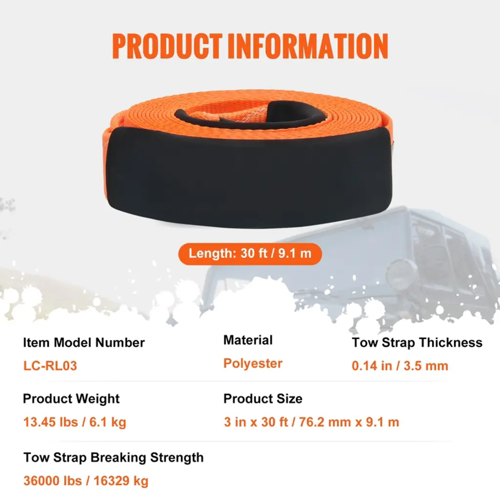 Vevor Polyester Heavy Duty Tow Strap Recovery Kit 3" X 30 Ft (Mbs-36,000 Lbs) Winch Strap, Triple Reinforced Loop
