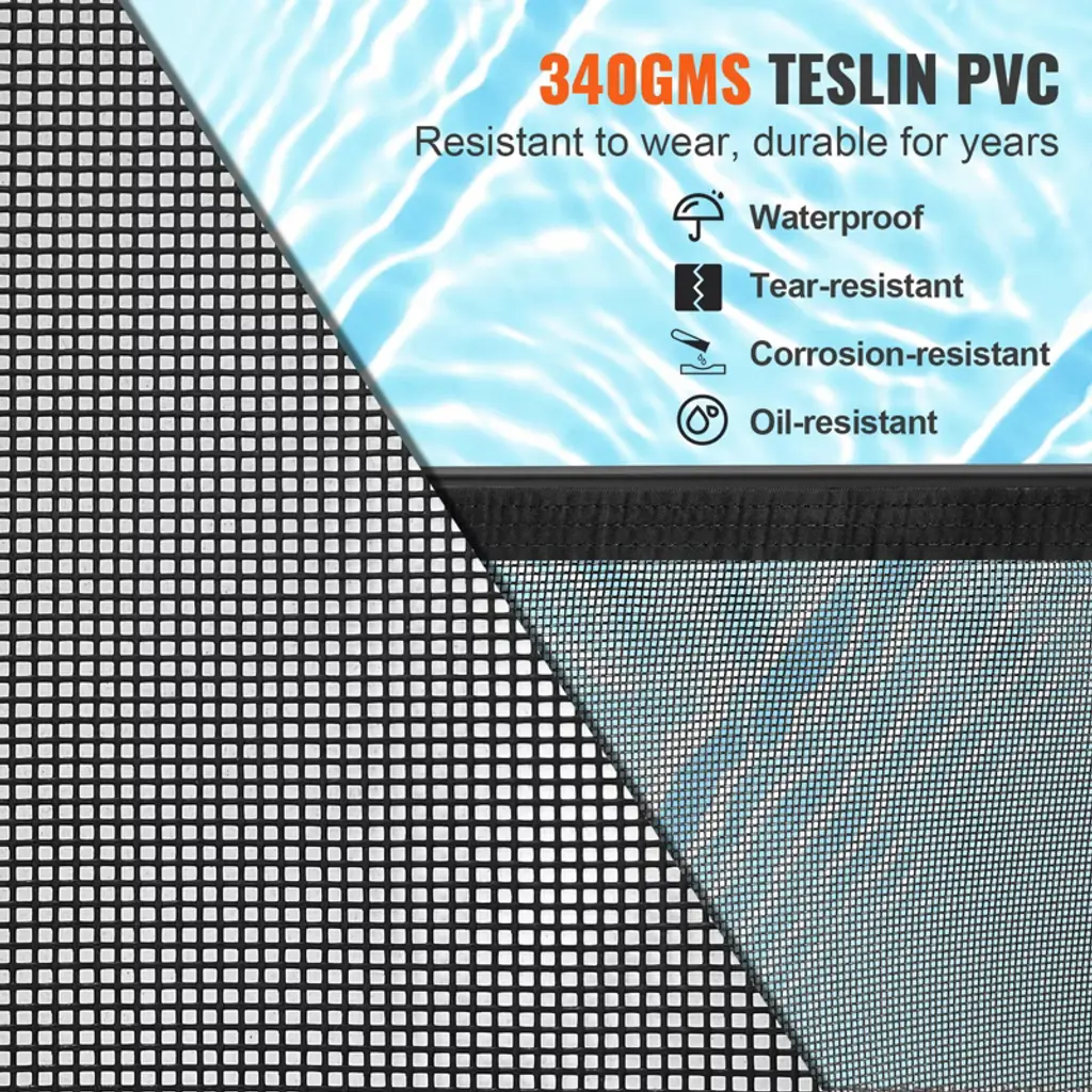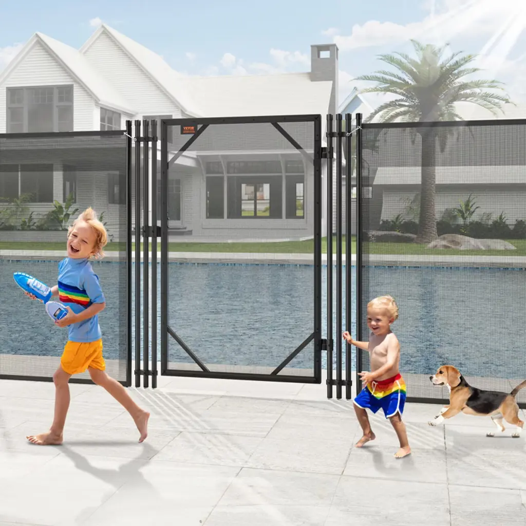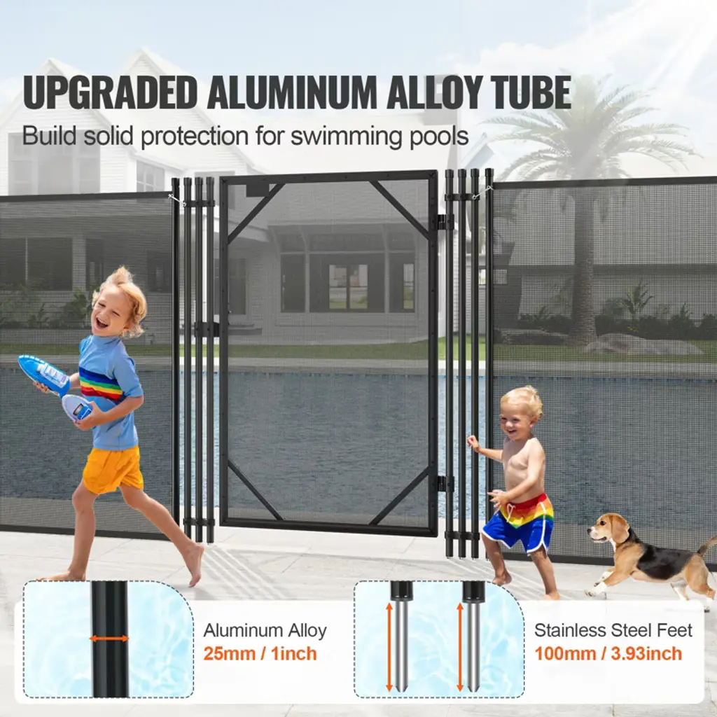 Pool Fence Gate, 4 x 2.5 Ft, Easy DIY Installation Inground Pool Gate, Pool Fence Gate Kit with Stainless Steel Latch, Removable Child & Pet Security Pool Fencing Feature: Sturdy Pool Gate Frame: The exquisitely crafted pool fence gate features 1-inch thick square aluminum poles and 3.9" long stainless steel legs, providing superior corrosion resistance and durability for long-term stability and security. Premium Teslin Material: The pool gate frame is constructed with 340 gms Teslin PVC mesh fabric, utilizing triple-needle stitching to enhance durability, ensuring both the aesthetics and practicality. Innovative Stainless Steel Latch: The simple lock structure with a push-pull switch makes opening and closing the inground pool gate effortless. The latch is positioned 20cm above the gate to enhance safety and prevent accidental opening by children. Quick and Easy Assembly: Hooks are pre-installed on the poles, simplifying the installation process. One person can easily install the entire swimming pool gate, saving you time and effort while ensuring convenience and safety. User-friendly Details: Equipped with an auxiliary installation drilling template and detailed installation instructions, we recommend using a 0.63" drill bit (not included) to ensure precise installation and perfect fitting of the pool security gate. Package Content: 4 x Screws (Black) 2 x Gate Pole Mounting Brackets 5 x Foot Sleeve Caps 5 x Foot Sleeve 1×Auxiliary Installation Gauge