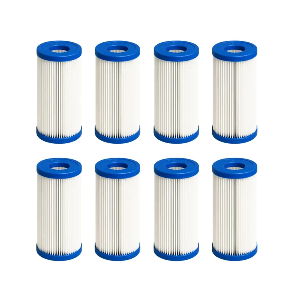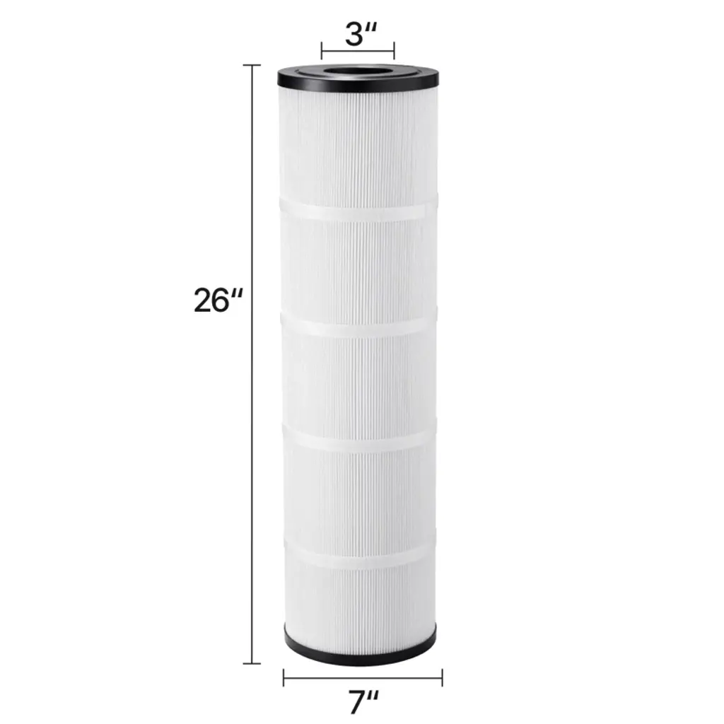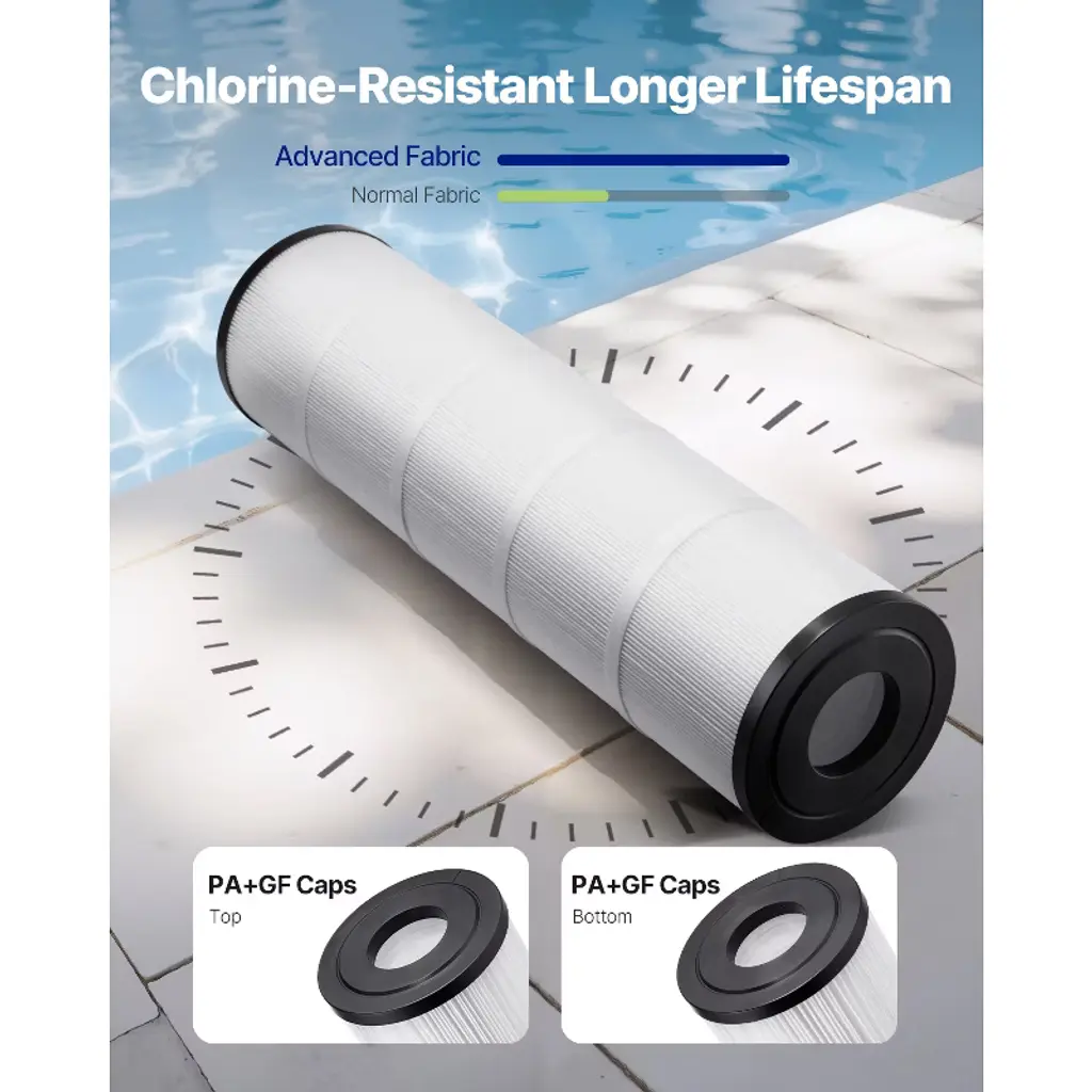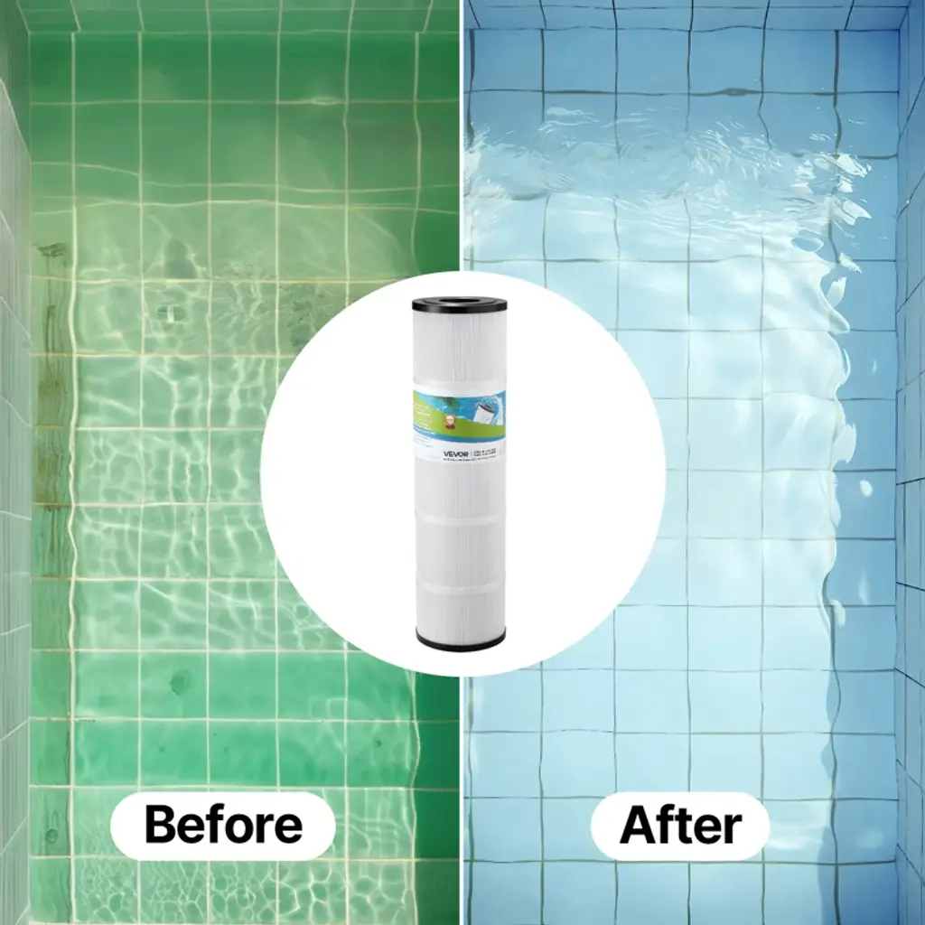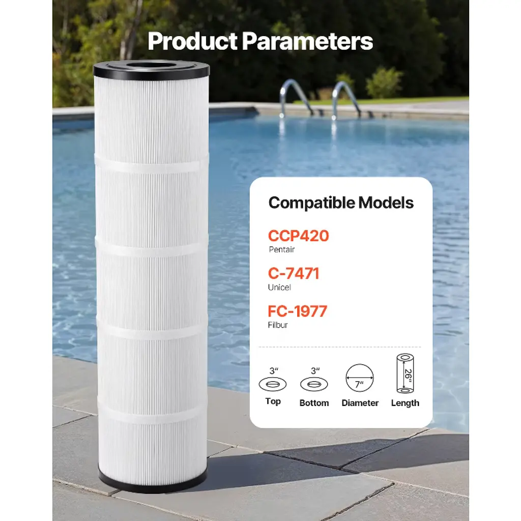 Feature: Product Specifications: Length: 26 in. Outer Diameter: 7 in. Inlet/Outlet Diameter: 3 in (approx. 7.6 cm). Filtration Area: 4 x 105 sq. ft. Filter Material: Triloble high-efficiency filtration fiber. Compatible Replacement Models: The GL-420-1 pool water filter is compatible with the following models: VEVOR GL-420-1, Pentair CCP420, Pleatco PCC80-PAK4, 178584, Ultraf-A6, Unicel C-7471, 817-0106, R173576, Filbur FC-1977, 570-0425-07. Note: This is a third-party compatible accessory. The listed brands and models are for reference only. VEVOR is an independent brand. EPA Certification: This pool and spa filter cartridge are EPA certified. With 50-micron filtration precision, they effectively capture hair, leaves, dust, debris, and fine particles, ensuring clean and clear water. High-Efficiency Filtration Performance: Made from quality trilobal fiber filter material, the hot tub filter offers exceptional dirt-holding capacity, enhances system backpressure stability, and deep-cleans pollutants. Its high-permeability structure reduces flow resistance, ensuring efficient pump operation. The reinforced end caps and center support structure enhance system durability. Easy to Clean: This pool filters for inground pools is easy-to-clean, high-efficiency pool filter makes maintenance simple. A quick rinse restores the pool water filter's performance, ensuring long-lasting durability and efficiency. Package Content 1 x Instruction Manual