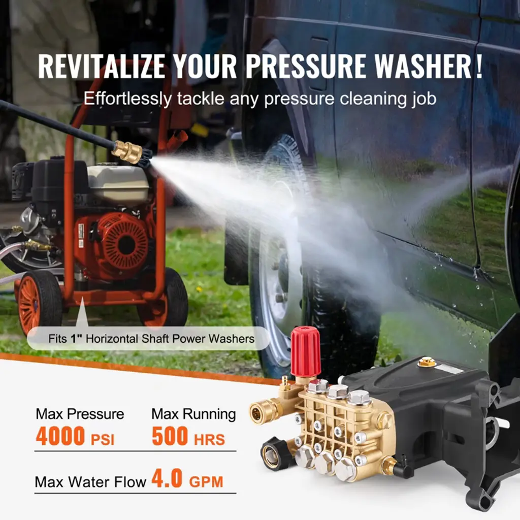 Vevor Pressure Washer Pump, 1" Shaft Horizontal Triplex Plunger, 4000 Psi, 4.0gpm, Replacement Power Washer Pumps Kit With 5 Nozzles, Black
