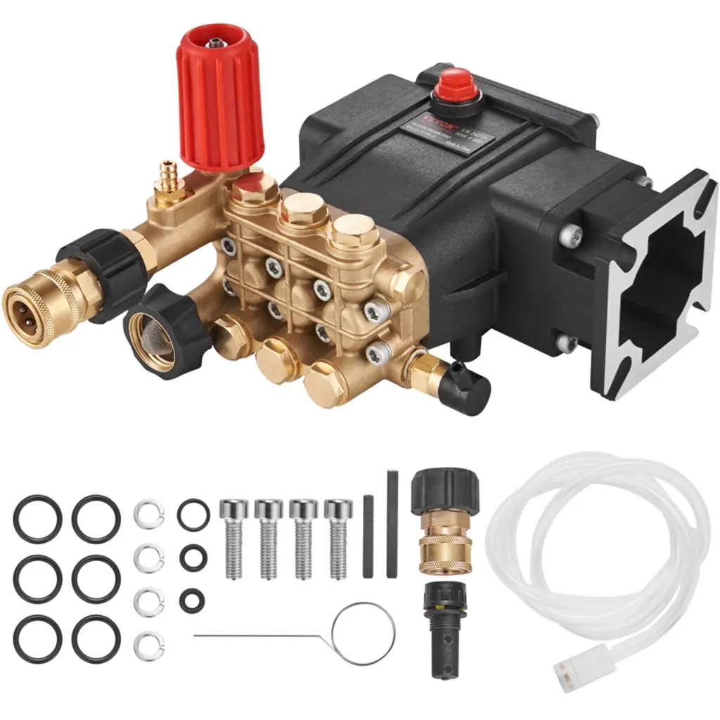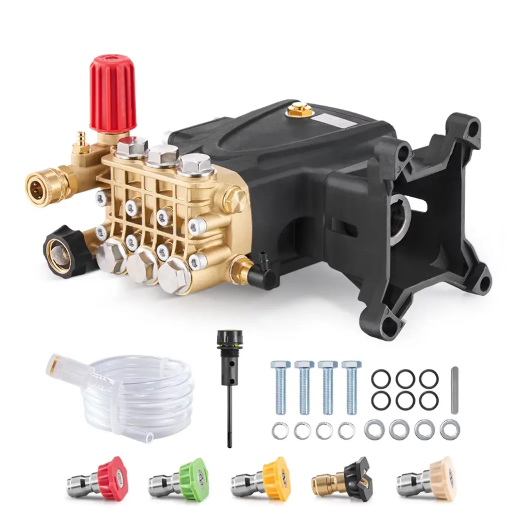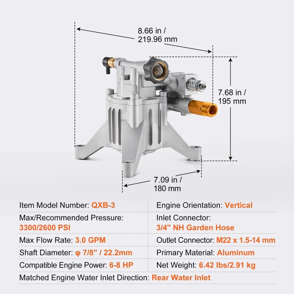 Feature: High-Efficiency Cleaning Power: Our pressure washer pump delivers powerful water pressure up to 3300 PSI with a maximum flow rate of 3.0 GPM, ensuring fast completion of various cleaning tasks, from household to commercial use. (Recommended working pressure: 2600 PSI to extend lifespan.) Strong Compatibility: Designed for 7/8-inch vertical shaft rear-outlet engines, this power washer pump fits most 196-230cc 6HP-8HP engines with a standard SAE bolt pattern, making pump replacements easy and efficient. Comprehensive Accessories: The replacement power washer pump comes with 5 nozzles to tackle various cleaning tasks. Each kit includes 1 x nozzle cleaning pin, 1 x siphon tube, 2 x shaft keys, 3 x M8 flat washers, and 3 sets of M8 hex bolts & nuts. Maintenance-Free Design: This replacement pump for power washer features a maintenance-free crankcase, eliminating the need for oil changes. Ideal for 2500-3100 PSI and 3.0 GPM electric washers, it is perfect for cleaning walls, fences, sidewalks, vehicles, and more. Durable, Long-Lasting Design: Made from cast aluminum, the parts washer pump body provides excellent corrosion resistance and durability, extending its service life and ensuring reliable performance for up to 150 hours of continuous operation. Package Content 1 x Pressure Washer Pump 5 x Nozzles 1 x Siphon Tube With Filter 2 x Flat Keys 1 x User Manual 3 x Pair of Mounting Bolts and Nuts