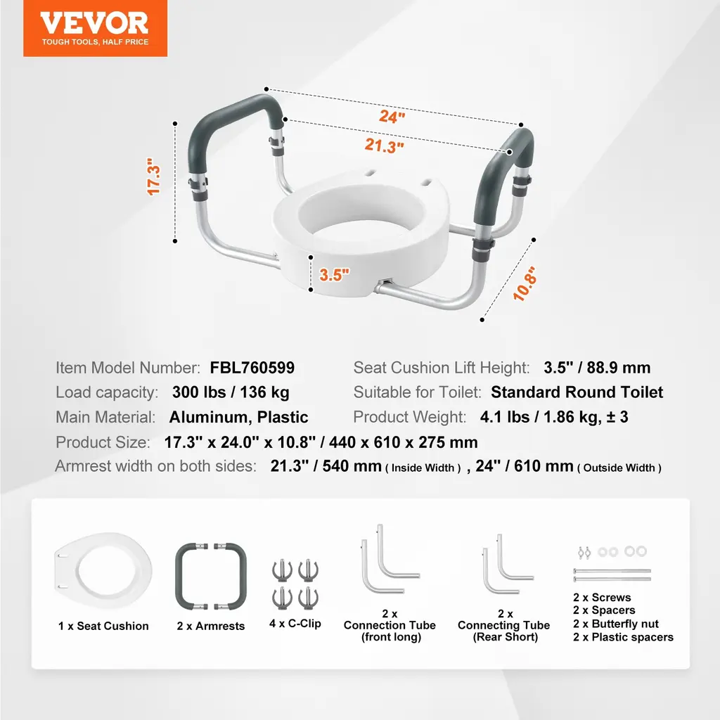 3.5" Raised Toilet Seat: This toilet seat pad of ours can be elevated to raise the toilet ring by 3.5" / 88.9 mm, providing a comfortable toileting option for pregnant women, the elderly, the injured, and the disabled, and reducing the burden on joints. Compatible with Standard Round Toilets: This toilet needs to be installed underneath the toilet lid, which is required for the shape of the toilet, and fits most standard round toilets. Armrests with Soft Padding: The specially designed 1.4" / 35 mm thick armrest padding provides a comfortable and reliable grip and extra help when sitting or standing. Sturdy Materials and Construction: Mainly made of aluminum and high-strength plastic, the raised toilet seat is sturdy and durable, with a weight capacity of up to 300 lbs, which is safe for people of different body weights and easy to clean all over. 4-Step Installation: The raised toilet seat can be securely fastened with the included screws and washers without the use of tools, and does not take up much space in your bathroom after installation. 7-Position Adjustable: We've incorporated a spring-loaded hole design in the legs, allowing for customizable height adjustments. It offers a comfortable toileting solution for pregnant women, seniors, injured individuals, and people with disabilities, reducing joint strain. Sturdy Materials and Construction: Crafted primarily from aluminum, the toilet riser is sturdy and durable, supporting weights of up to 350 lbs. Users of different body types and weights can confidently use it, making it especially suitable for those needing additional support. Four-Legged Floor Design: The floor-based raised toilet seat only requires assembly of the legs, making it highly compatible with most standard round and elongated toilets. Soft and Thick Cushion: The specially designed 1.4" / 35mm thick soft cushion with a leather surface ensures long-term comfort during toilet use and is easy to clean. Convenient Accessories: During toilet use, you can conveniently store your phone or magazines in the storage bag, making tissue retrieval easier. Package Content 1 x Seat Cushion 2 x Connection Tube (Front Long) 2 x Connecting Tube (Rear Short) 2 x Armrests 4 x C-Clip 2 x Screws 2 x Butterfly Nut 2 x Spacers 2 x Plastic Spacers 1 x Instruction Manual