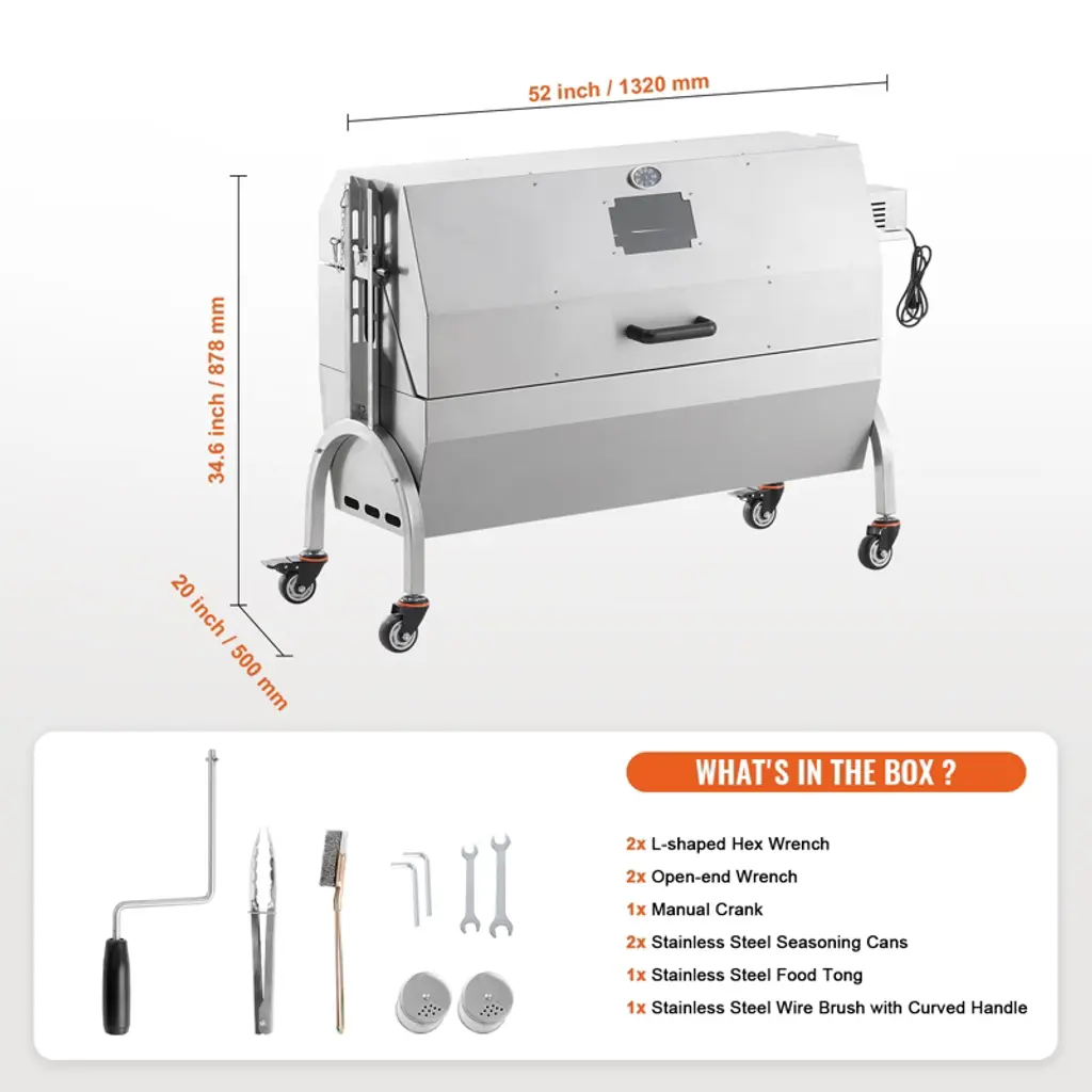 Feature: Enhanced Heat Shield: The grill rotisserie kit features a newly upgraded motor, making grilling easier! It includes a powerful 52W motor that can effortlessly rotate the spit rod at 4 RPM. The enlarged heat plate and increased motor fan power effectively block heat sources from impacting the motor, reducing motor malfunctions. Large Load Capacity: This bbq pig rotisserie kit has a total weight capacity of 198 lbs, with a grill net capable of carrying 132 lbs, and comes with an automatic barbecue fork. The 46-inch barbecue grill provides ample space for your food, accommodating various meats simultaneously, allowing you and your family to enjoy an unparalleled smoky flavor. Note that the actual maximum load-bearing capacity is 66 lbs net weight after food processing. Durable and Easy to Clean: Made from sturdy stainless steel, the lamb grill roaster is designed to withstand various foods. It prevents wear, corrosion, and dust, ensuring long-term use. Easy to clean, simply wipe with a soft sponge. Adjustable Heights: Designed with 4 different height holes, the grill rotisserie system can be easily adjusted. The bbq rotisserie grill kit is designed to control cooking temperature. The upgraded 45-degree tripod ensures stability even on grass. The 2-in-1 design allows you to manually rotate the grill with the handle or install the motor for automatic rotation. Note: The highest gear is only applicable when opening the lid. If the lid is closed, the highest gear is not available. User-Friendly Design: The stainless steel rotisserie roaster comes with 4 detachable and lockable wheels, making it easier to move and providing more stability while cooking. Additionally, it includes 2 seasoning bottles, tongs, and a brush, making it the perfect grill for open flame and rotisserie cooking. The covered design includes a viewing window, allowing you to monitor the cooking status of your food at any time, adding to its convenience. Package Content 1 x Rotisserie Grill 1 x Set of Accessories