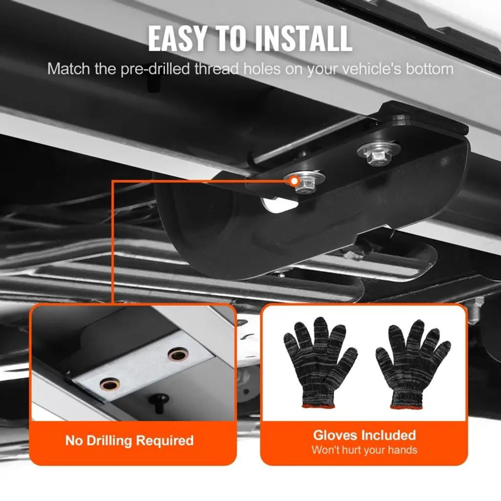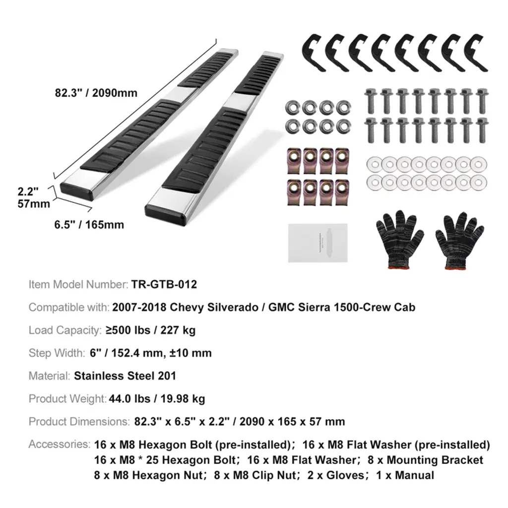 Feature: Wide Compatibility: Designed to fit a range of trucks, these running boards are compatible with the 2007-2018 Chevy Silverado/GMC Sierra 1500 Crew Cab, 2019 Silverado/GMC Sierra 2500HD and 3500HD Two-Seat Cab, and the 2019 Silverado/GMC Sierra 1500 LD Crew Cab. It serves as an excellent replacement for original pedals that are damaged, rusted, or aged, providing a reliable alternative for your vehicle. Withstand Harsh Weathers: Crafted from 201 stainless steel, the running board side step boasts high strength, durability, and corrosion resistance. It's designed to withstand harsh weather conditions, making it ideal for trucks frequently facing adverse road conditions. The nerf bar’s mirror-like surface is not only visually appealing but also easy to clean. Load-Bearing Capacity: Thanks to its high-quality materials and construction, the running board pedal can support weights of 500 lbs/227 kg, equivalent to 3-4 adults. This strength ensures the truck running board remains unbent under heavy pressure, maintaining its shape and functionality through continuous use. Wide & Non-Slip Step Bars: The 6-inch/152.4mm wide step bar provides easy access, enhanced by an anti-slip and UV-resistant surface with a distinct texture for additional safety. It's user-friendly for the elderly, children, and pets, protecting against slips and vehicle damage from road debris. Hassle-Free Installation: This running boards for trucks is designed for a easy installation on specified models, requiring only bolts, washers, and nuts for attachment without the need for drilling. Its anti-edge design prevents scratches, and included gloves ensure hand protection during installation. NOTE: Not Suitable for All Diesel Model Package Content: 16 x M8 Hexagon Bolt (pre-installed) 16 x M8 Flat Washer (pre-installed) 16 x M8 * 25 Hexagon Bolt 16 x M8 Flat Washer 8 x Mounting Bracket 8 x M8 Hexagon Nut 8 x M8 Clip Nut 1 x Gloves 1 x Manual
