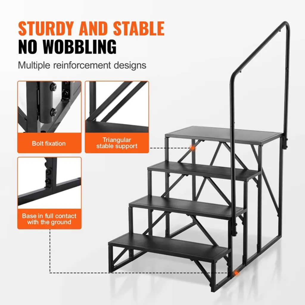 Feature: 440 lbs Stable Load Capacity: Our 4-step RV Steps is made of heavy-duty and durable alloy steel, with a weight capacity of up to 440 lbs/199.58 kg. It can support two individuals entering or exiting the RV simultaneously, without deformation or damage. Preventing Accidental Falls: The ladder's handrail provides additional support for stability during boarding and disembarking. Wide steps ensure full contact with both feet, offering strong traction and reducing the risk of slipping. The step height is carefully planned to prevent tripping. Rust-Resistant Material: The steel ladder surface is coated with a black powder coating, providing strong rust resistance and durability. You can confidently use it outdoors, even in rainy or snowy weather, without worrying about damage, wear, or rust, ensuring long-lasting durability. Multiple Reinforcements: The overall structure is reinforced for added stability. You can assemble it according to the instructions. The bottom is reinforced with a triangular support and additional bolt reinforcement. The bottom base fully contacts the ground, ensuring stability during entry and exit without feeling shaky, providing peace of mind. Versatile Use: Thoughtfully designed to accommodate the needs of elderly, mobility-impaired individuals, children, and others entering or exiting the RV. It can also be used for various purposes such as travel trailers, pool spas, maintenance and renovation, garage and cabin stairs, dog ramps, etc., making it easy to reach elevated places. Package Content 1 x RV Steps 17 x M8*35 Hexagon Socket Head Cap Screws (1 extra included) 44 x M8*15 Hexagon Socket Head Cap Screws (2 extra included) 61 x Flat Washers 8 (3 extra included) 4 x M6*7 Hexagon Socket Head Cap Screws (pre-installed) 1 x Phillips Head Screwdriver 5 1 x Hex Key 4 1 x Hex Key 5