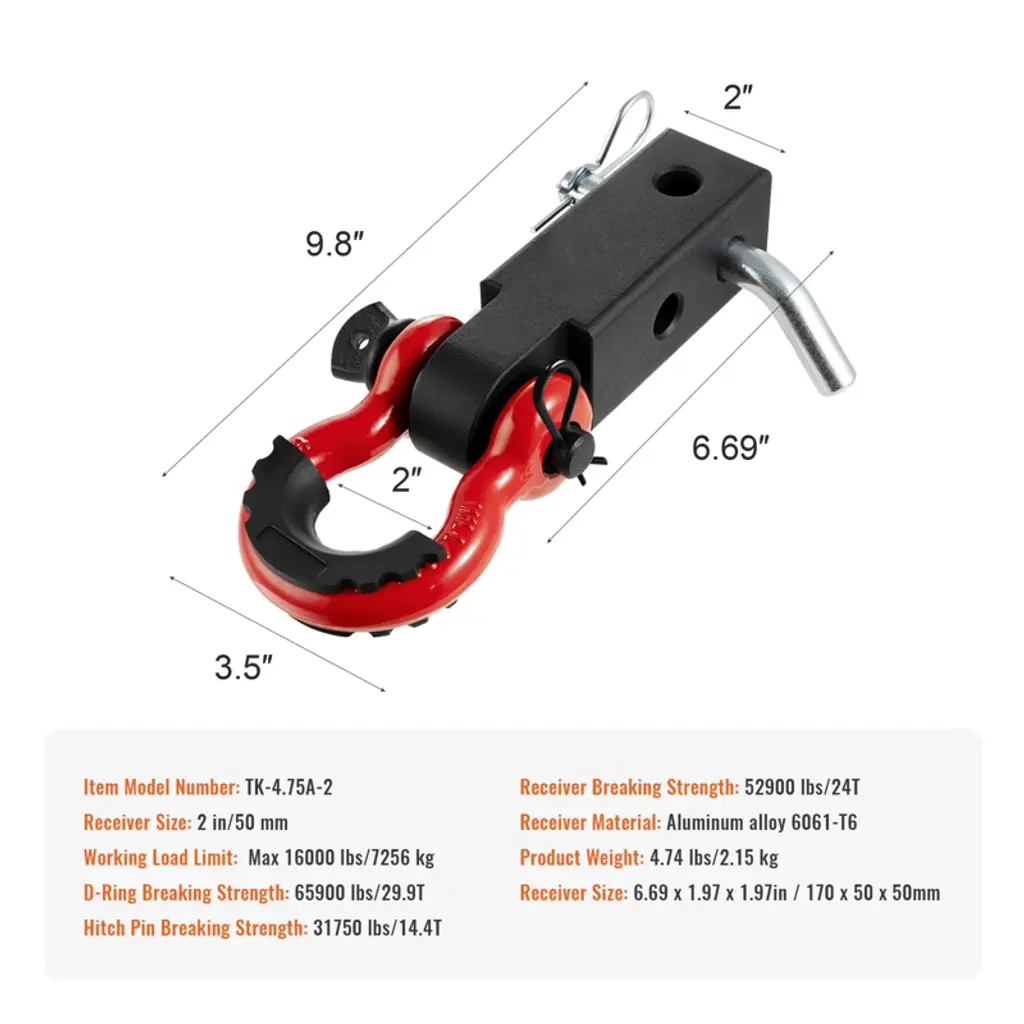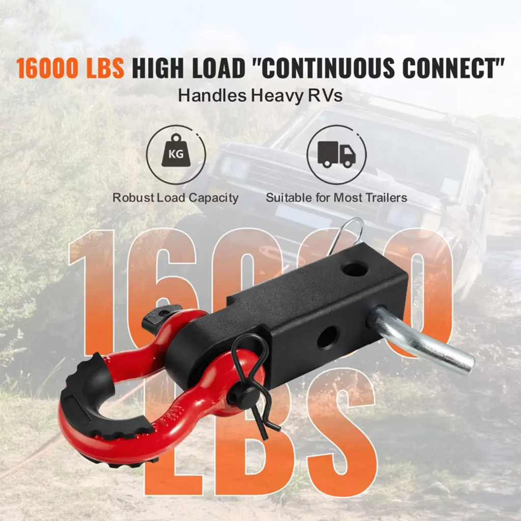 Feature: High Load Capacity: Capable of towing up to 16,000 lbs, our shackle hitch receiver tackles big jobs with ease. Perfect for RVs, SUVs, and vans, it provides the stability and strength you need for demanding tasks without compromising on security. Industrial-Grade Aluminum Alloy: Constructed from industrial-grade material, this lightweight yet durable tow hitch receiver stands up to wear and tear. Its superior corrosion resistance ensures it can handle any environment, extending its life and your adventures. Protective Coating: With special baked-on paint, our shackle mount trailer hitch boasts excellent protection against rust, splashes, and scratches. This durable layer keeps your setup looking new and dependable, even in tough weather. Enhanced Details: Get your shackle trailer hitch up and running in no time—no welding or complex tools needed! Just connect the shackle, and you're set. Enhanced security features like a D-ring bolt with an R-pin and a bright reflective sticker improve visibility and security at night. Versatile and Essential: Ideal for more than just towing, this recovery hitch receiver is your go-to for rescues, camping, and barbecues. Its multifunctional design ensures it's an essential part of your kit, ready to support your outdoor adventures whenever, wherever. Package Content: 1 x Shackle Hitch Receiver