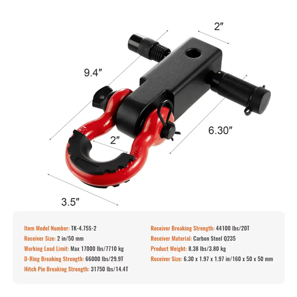 Feature: High Load Capacity: Capable of towing up to 17,000 lbs, our shackle hitch receiver tackles big jobs with ease. Perfect for RVs, SUVs, and vans, it provides the stability and strength you need for demanding tasks without compromising on security. Industrial-Grade Carbon Steel: Constructed from industrial-grade material, this lightweight yet durable tow hitch receiver stands up to wear and tear. Its superior corrosion resistance ensures it can handle any environment, extending its life and your adventures. Protective Coating: With special baked-on paint, our shackle mount trailer hitch boasts excellent protection against rust, splashes, and scratches. This durable layer keeps your setup looking new and dependable, even in tough weather. Enhanced Details: Get your shackle trailer hitch up and running in no time—no welding or complex tools needed! Just connect the shackle, and you're set. The included lock prevents product loss and adds an anti-theft function. Enhanced security features like a D-ring bolt with an R-pin and a bright reflective sticker improve visibility and security at night. Versatile and Essential: Ideal for more than just towing, this recovery hitch receiver is your go-to for rescues, camping, and barbecues. Its multifunctional design ensures it's an essential part of your kit, ready to support your outdoor adventures whenever, wherever. Package Content: 1 x Shackle Hitch Receiver