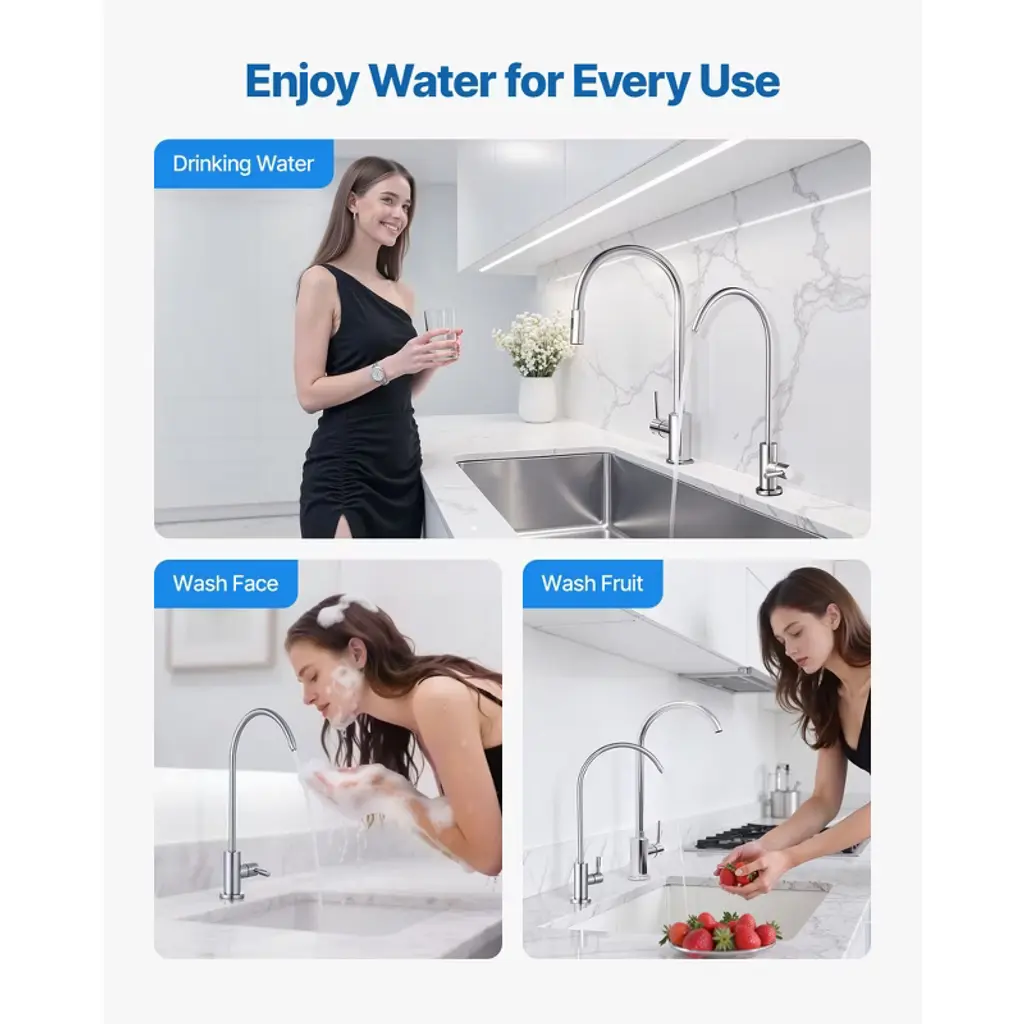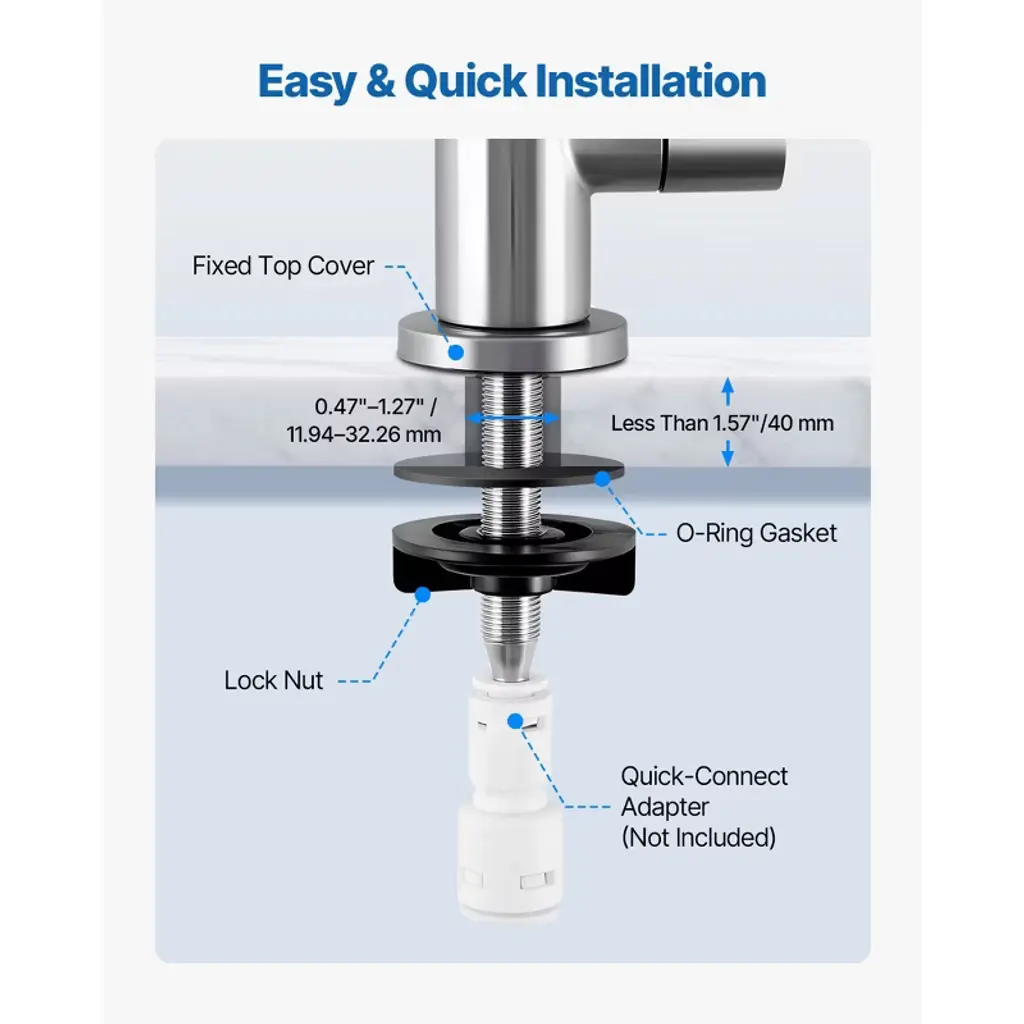 Feature: Safe, Quality Materials: Our drinking water filter faucet combines food-grade 304 stainless steel with a durable lead-free brass valve core. Dual protection stops heavy metals from leaching, ensuring clean water from the source. ANSI 61 tested for your family's daily health Smooth & Effortless Use: Our filtered water faucet has a 360° rotating high-arc gooseneck and smooth quarter-turn handle. Perfect for filling large pots, it combines graceful looks with practical function, elevating your kitchen style while providing fresh, filtered water Leak-Free Performance: This water purifier faucet features an integrated O-ring seal and a brass valve core that secures the connection tightly. No drips, leaks, or backflow—just a stable, lasting performance that keeps your water and your kitchen clean every day Simple Assembly: VEVOR reverse osmosis faucet includes all essential parts—mounting cap, washer, and base cover—for a smooth setup. No special tools or professional help needed. Install it yourself in just minutes and start enjoying clean, fresh water right away Wide, Versatile Fit: This stainless steel faucet fits sink holes from 0.47-1.27 in (11.94-32.26mm) and supports mounting plates up to 1.57 in (40mm) thick. It pairs easily with most filtration systems and under-sink units. The modern look works beautifully in kitchens, bars, or RVs Package Content 1 x Stainless Steel Faucet 1 x User Manual 1 x Rubber Gasket 1 x Bottom Locking Cap 1 x Top Locking Cap