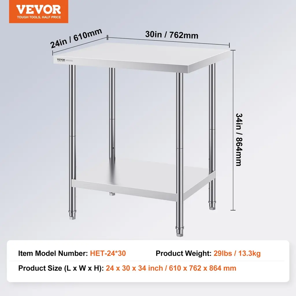 Vevor Stainless Steel Prep Table With 3 Adjustable Height Levels, Commercial Workstation For Kitchen Garage Restaurant Backyard - 24 X 30 X 34 Inch