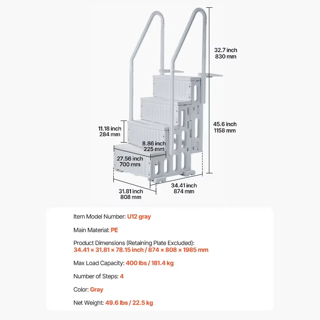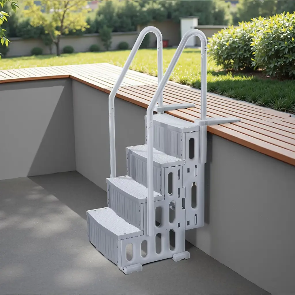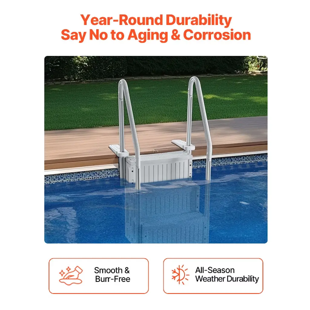Feature: 4-Step Double Handrails Ladder: The pool ladder features 4 steps and double handrails on both sides, with a comfortable inclined design that makes it easier to enter and exit the pool. It can be installed in pools with depths ranging from 48 to 54 inches. This ladder is ideal for use in outdoor bathhouses, indoor swimming pools, open-air baths, water parks, and more. Reliable 400 lbs Weight Capacity: With a weight capacity of up to 400 lbs, this pool stair is the first choice for both children and adults. The thickened step boards are designed with non-slip textured surfaces to ensure security with every step. Installation Is a Gentle Breeze: The snap-on installation design allows for a tight connection between ladder parts. The hollow side panels help water flow through, reducing buoyancy. For optimal stability, we recommend filling the stair’s pipes with water or sand during installation. NOTE: Ensure the height of the first downward step is 12.6 inches / 320 mm from the ground. Sturdy & Built-to-last Design: Made of PE material, this swimming pool stair is built to withstand all seasons and is fearless to the harsh effects of outdoor sun exposure and aging. You can trust this ladder to avoid accidents and provide durability. The ergonomically designed handrails with rounded edges allow for a comfortable and secure grip. Complete Set of Accessories: Upon delivery, you can quickly assemble the ladder. Our retaining plates come with pre-drilled holes, so you only need to measure and drill for easy installation. Concrete, tile floors need to purchase their own expansion bolts for installation. Package Content: 1 x Pool Ladder 1 x Accessories Kit 1 x User Manual