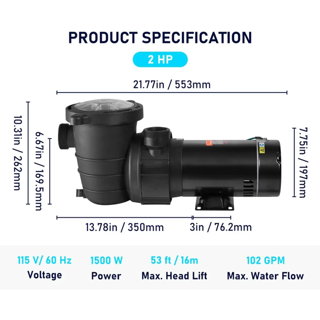 Swimming Pool Pump 2.0HP 115V 1500W, Single Speed Pumps for Above Ground Pool, Powerful Pool Pumps with Strainer Basket, 5400 GPH Max. Flow, ETL Certification Description: 2 HP Premium Quality Copper Motors: Voltage: 115 V / 60 Hz. A pure copper motor with stainless-steel motor shell provides not only an efficient and stable running but also has built-in thermal protection. Our swimming pool pump is a perfect option for circulating water filtration, constantly keeping your swimming pool crystal clear and sanitary. Corrosion-proof ABS Material: Different from others, our spa pump adopts an ABS shell and stainless steel shafts withstand harmful substances season after season. One-piece structure features non-leakage against wear and tear. Even water containing disinfectants can use this pump. Efficient Water Circulating System: Max. Water Temperature: 104 °F. Our pool pump can reach a 90 GPM continuous flow rate, lifting water flow up to 43 ft. The engineering plastics impeller can have max. 3450 RPM while maintaining a low noise to filter impurities quickly. What's more, the transparent lid gives you a clear view to timely clean up the detachable extra-large filter basket. Quality Standard for Security: We always focus on the security standards of our electronic motors. Our single-speed pool pumps have successfully passed ETL certification, letting you enjoy your pool with ease of mind. An earthing terminal is also set to connect the line on the ground for an extra layer of security. Pump up the heat and enjoy our quality pump all summer long. Wide Application: The speedy pool pump is ideal for above-ground pools, hot tubs, thermal springs, spas, and irrigation systems. However, it should not be used with storable pools. It will bring you a clean and clear water environment, so you enjoy your pool all summer long. Note 1. Please fill the pump with water to keep the motor from overheating for the first use. 2. During extreme weather conditions, do not keep electrical components operating. Package Content: 1 x Swimming Pool Pump 4 x Interfaces 1 x Power Cord