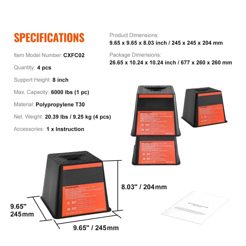 Trailer Jack Block, 6000 lbs Capacity per RV Leveling Block, High-quality Polypropylene RV Camper Stabilizer Blocks, RV Travel Accessories Use for Any Tongue Jack, Post, Foot, 5th Wheels, 4-Pack Description: Effortless Leveling: Improve your camping experience with our trailer jack blocks! Our blocks make leveling your RV a breeze, ensuring stability and comfort even on the most uneven terrain. Say goodbye to wobbling and discomfort caused by bumpy roads, and hello to hassle-free adventures! Swift Setup: No complex installations are required! Our RV camper blocks can be effortlessly positioned in minutes, and you can stack the jack blocks to adjust the height, ensuring your RV stabilizer/jack remains balanced for a convenient and enjoyable camping experience. Enhanced Stability: Our RV stabilizer blocks with an increased footprint, you'll enjoy superior stability no matter where you park. Upgrade your camping game today and experience the peace of mind that comes with safe and secure camping. Built to Last: Crafted from durable materials, our travel trailer leveling blocks resist various environmental challenges such as UV exposure, water, high temperatures, oil, tar, and soil. The integrated drainage hole design prevents rust and ensures long-lasting protection for your RV. Versatile Compatibility: Our camper stabilizer blocks are designed to accommodate a wide range of vehicles, such as travel trailers, campers, and motorhomes. Enjoy the convenience and versatility that our trailer jack blocks bring to your travels. Package Content: 4 x Trailer Jack Blocks 1 x Instruction