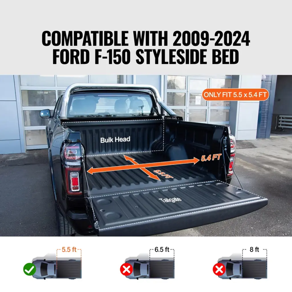 Vevor Truck Bed Cover, Roll Up Truck Bed Tonneau Cover, Compatible With 2009-2024 Ford F-150 Styleside Bed, For 5.5 X 5.4 Ft Bed, Soft Pvc Material