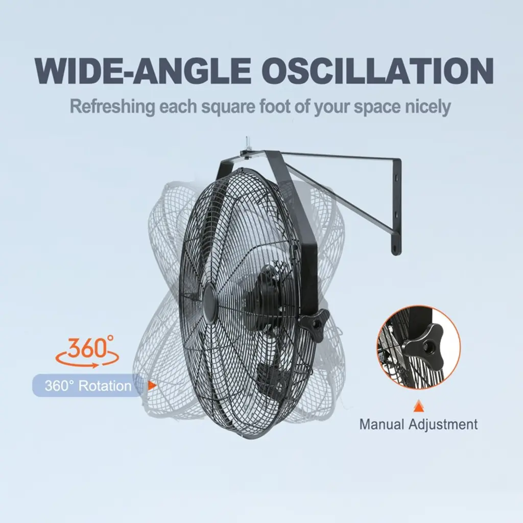 Feature: Keep You Cooler: It's more than just a cool breeze you get! Our outdoor wall fan is IP44 rated for water resistance; you don't have to worry about rusting it rusting away. (Use with your misting kit for better effect) Move Lots of Air: The metal pull-string is convenient for you to control 3 speeds. Performance is rated at a maximum of 4150 CFM with a reach of around 30 ft. Escape your air-conditioned cave and enjoy the outdoors, even in peak heat. Power without Noise: ETL listed. 1500 RPM, 90 W copper motor with all metal casing contributes to a farther air movement range at lower noise. Our wall mounted fan comes with 6 ft power cord for your maximum convenience. Keep flies away during relaxing summer days! Adjustable Wall Mounted Fan: Get ready to reach every corner of the room! The 17.6'' weatherproof wall fan can be tilted vertically for optimum airflow. Get ready for a complete heavy-duty metal construction with aluminum blades for easy disassembly and cleaning. Perfect for Outdoor & Indoor: Install our fans on the walls or posts of patios, garages, and feed pens. Not only will you enjoy cooling relief from the heat, but your pets and plants will benefit from a cooler outdoor environment. Who knows, your orchid plant might bloom again. Package Content 1 x Industrial Wall Fan 1 x User Manual