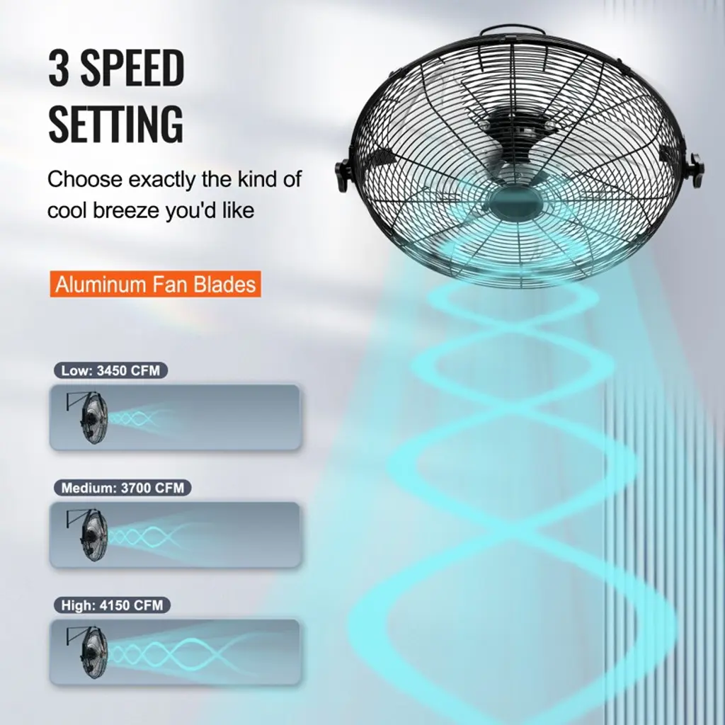 Feature: Keep You Cooler: It's more than just a cool breeze you get! A set of 2 wall-mounted fans, perfect for large spaces or multiple locations, providing wide-range indoor cooling all at once. Move Lots of Air: The metal pull-string is convenient for you to control 3 speeds. Performance is rated at a maximum of 4150 CFM with a reach of around 30 ft. Escape your air-conditioned cave and enjoy the outdoors, even in peak heat. Power without Noise: 1500 RPM, 90 W copper motor with all metal casing contributes to a farther air movement range at lower noise. Our wall mounted fan comes with 6 ft power cord for your maximum convenience. Keep flies away during relaxing summer days! Adjustable Wall Mounted Fan: Get ready to reach every corner of the room! The 18'' wall fan can be tilted vertically for optimum airflow. Get ready for a complete heavy-duty metal construction with aluminum blades for easy disassembly and cleaning. Perfect for Indoor Use: Install our fans on the walls or posts of patios, garages, and feed pens. Not only will you enjoy cooling relief from the heat, but your pets and plants will benefit from a cooler outdoor environment. Who knows, your orchid plant might bloom again. Package Content 1 x Industrial Wall Fan 1 x User Manual
