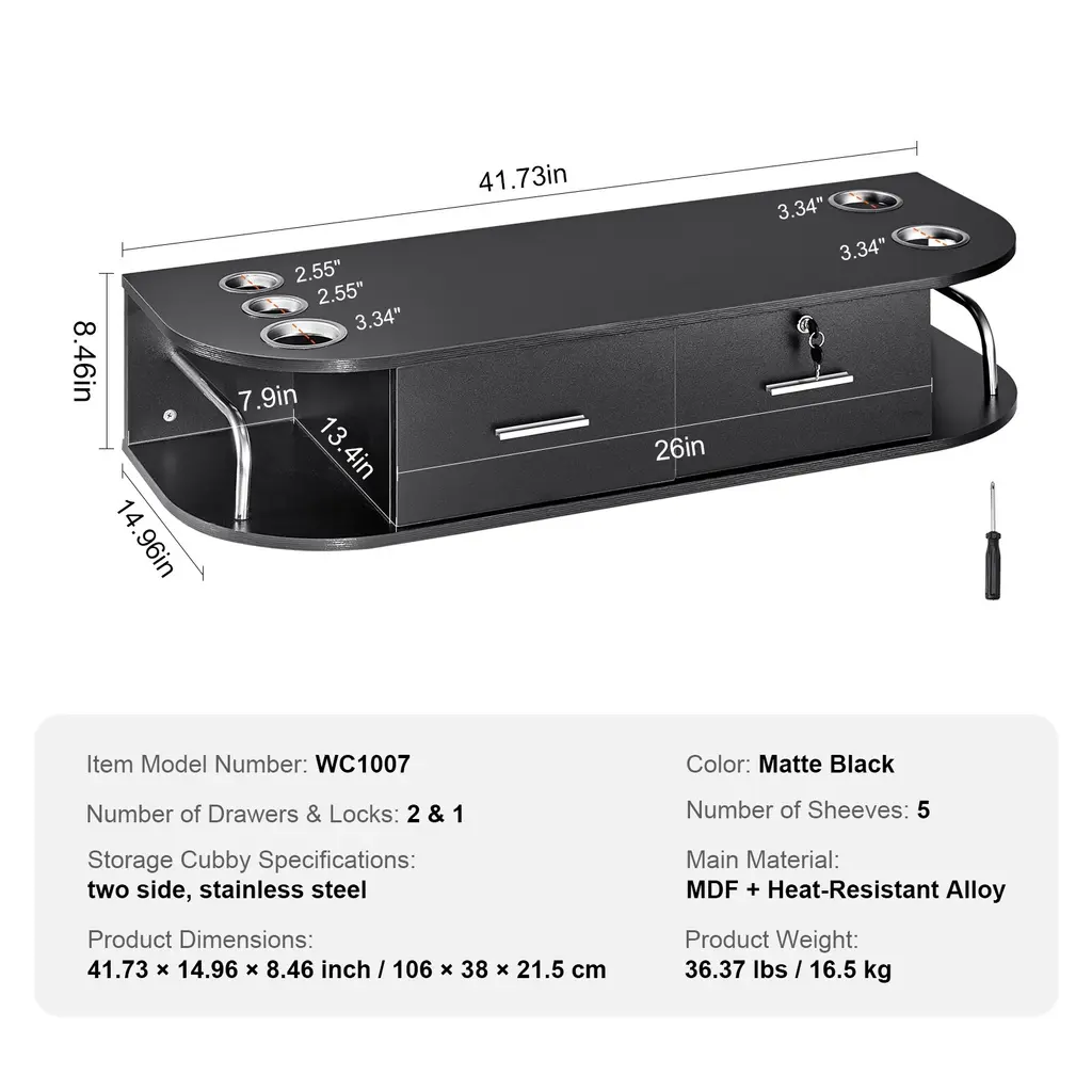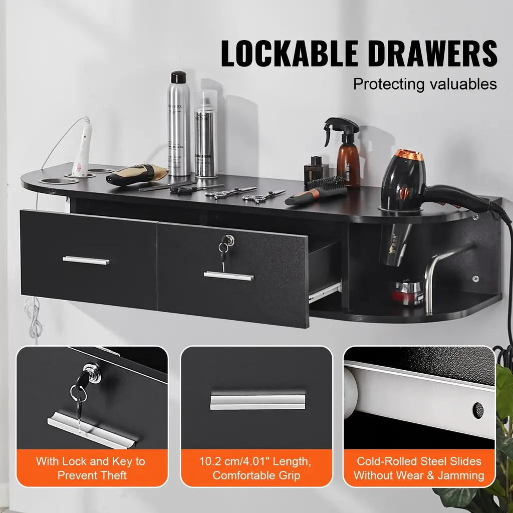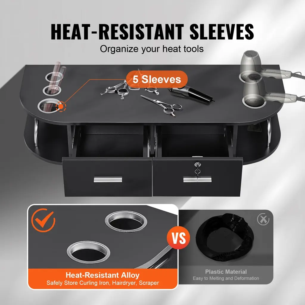 All-in-One Barber Station: Put common-use hairdressing tools on the spacious tabletop for quick access. The lockable drawer stores valuables securely, while the side storage space is perfect for storing cleaning supplies, creating a tidy work environment. Durable Material: Constructed with a thickened MDF board and a matte black PVC double-decorative surface, our salon station is waterproof and easy to clean. Its versatile design complements various interior decor styles, enhancing aesthetics. The styling station is also constructed with the same durable materials, ensuring long-lasting quality and style. Heat-Resistant Tool Sleeves: Made of heat-resistant alloy material, the hair styling salon station provides 5 heat tool sleeves with a bottom cover design to prevent tools from falling, ensuring safety during use. Wall-mounted Design: The wall-mounted salon station maximizes floor space utilization, providing a more spacious and illuminated workspace, thereby enhancing work efficiency. It also features double-sided storage compartments with stainless steel guardrails allowing for various commonly used tools and supplies, preventing items from falling and improving work efficiency. Easy Assembly: Numbered markings on the boards and categorized packaging of accessories simplify assembly. This barber station is suitable for various settings such as hair salons, beauty salons, makeup rooms, spas, and homes. Package Content 1 x Wall Mount Styling Station