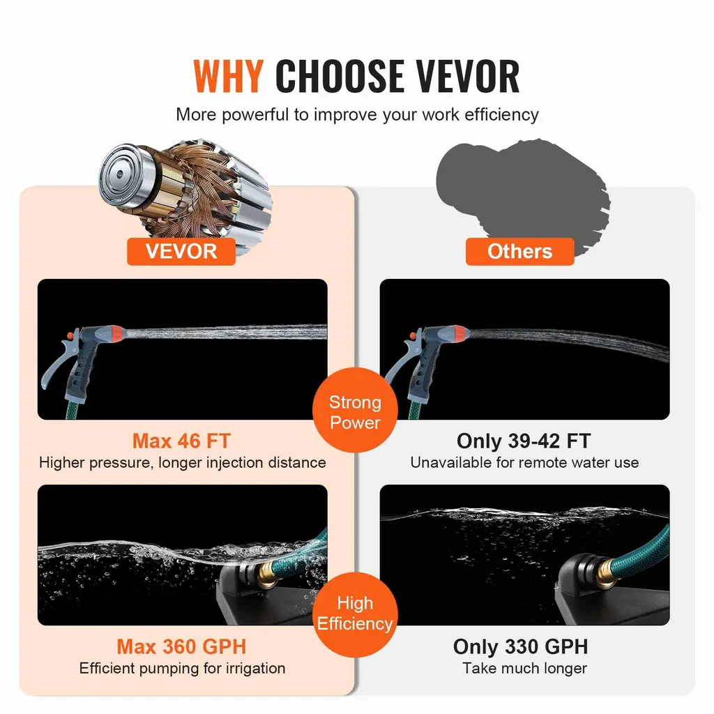 Revolutionary Water Transfer: Are you ready for quality water control? Experience unbeatable efficiency with our 1/10 HP water transfer pump, delivering up to 360 gallons per hour and a 46 ft pumping height. Elevate your water transfer game!Steady & Whisper-Quiet: The flat base design has a larger contact area with the ground, making the water transfer utility pump more stable throughout the operation. It keeps your pump secure in place without slipping or tipping and reduces noise.Stand Up to Wear & Corrosion: Crafted from sturdy aluminum alloy, our transfer water pump is wear-resistant, lightweight, and built to last. You can carry it anywhere with a portable handle. An electrostatic spray finish makes it smooth, delicate, and resistant to stains and corrosion.All-Inclusive Kit: The portable electric utility pump comes with a 6 ft suction hose, water suction strainer, impeller, and two carbon brushes. You have everything you need for hassle-free water management. It is perfect for draining aquariums, pools, and flooded areas or watering your gardens.Instructions for Use: Please add water through the inlet to submerge the impeller before first use. Ensure the electric utility pump is not used in water and the water source is free of large particle impurities! Don't run the pump dry! Please turn off the pump when the water level drops below 1/8 inch.Package Content1 x Water Transfer Pump1 x 6 ft Suction Hose2 x Carbon Brushes1 x Impeller1 x Water Suction Strainer