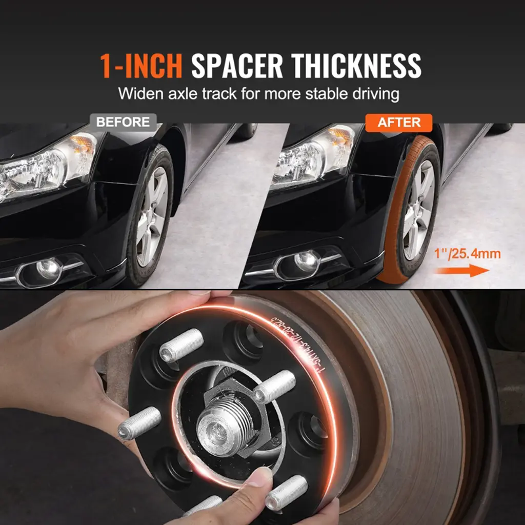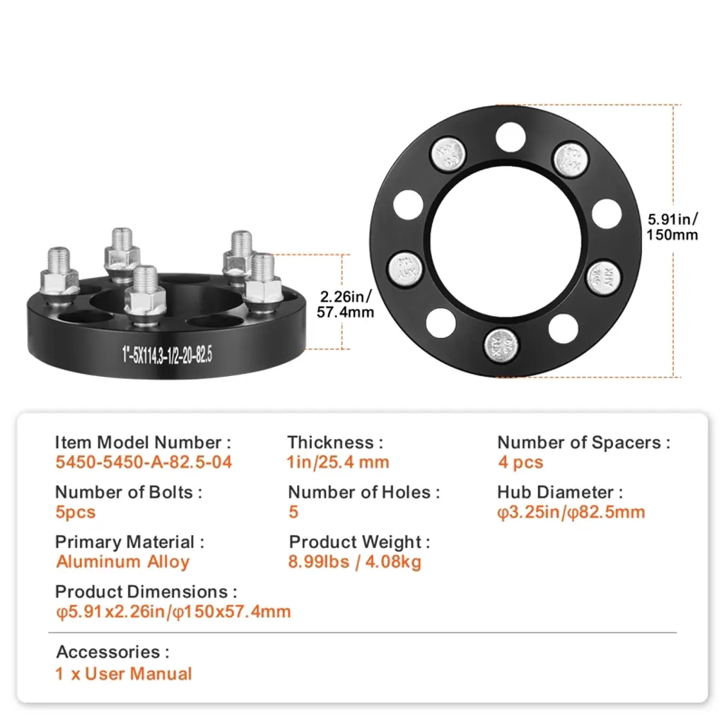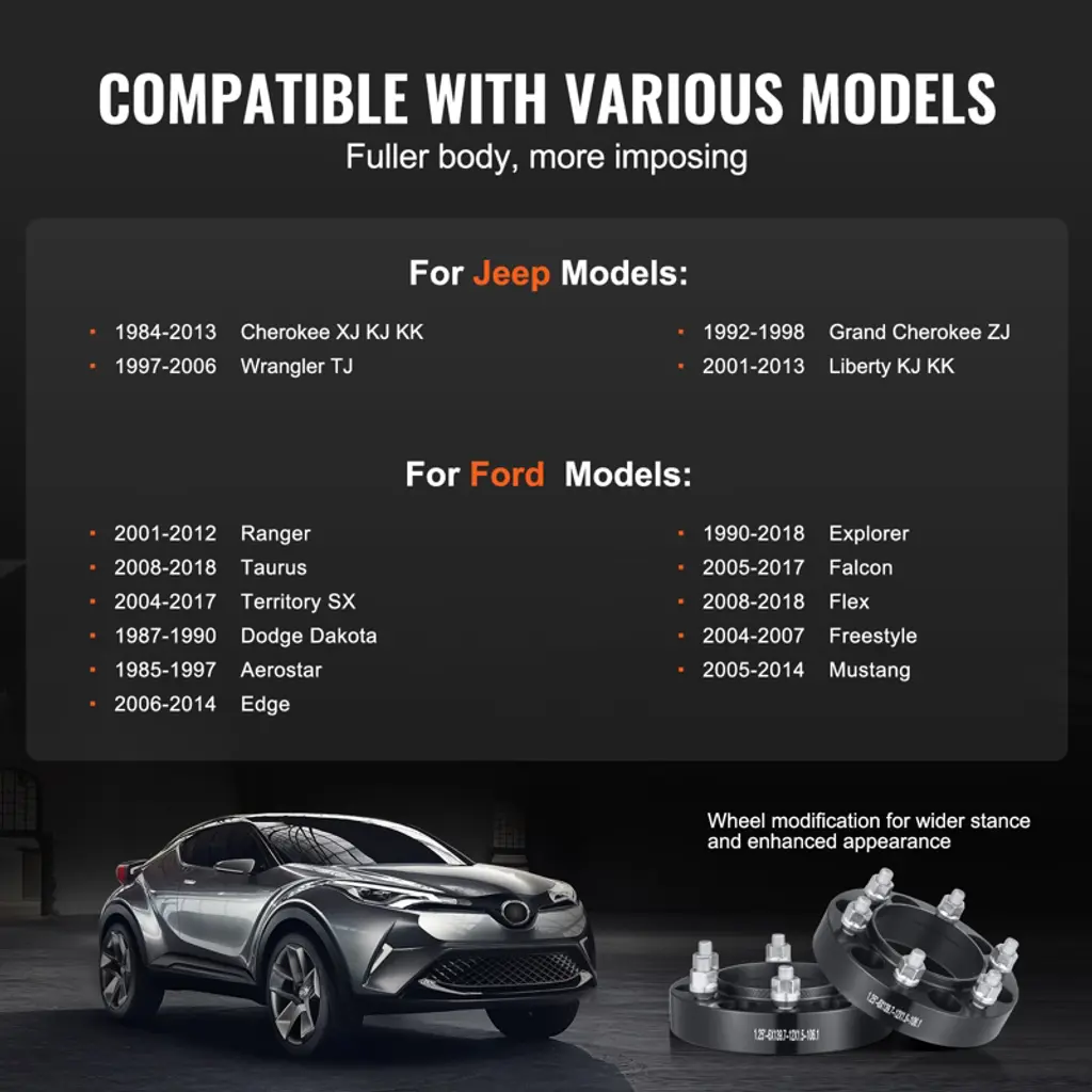 Feature: Enhanced Driving Safety: These wheel spacers increase the axle track by 1 inch, widening the wheel track to lower the vehicle's center of gravity. This effectively solves severe body sway during high-speed cornering, significantly improving the vehicle's grip, stability, and handling. Product Specifications: Our wheel adapters includes 4 wheel spacers, each with a thickness of 1 inches (25.4mm), a bolt pattern of 5 x 4.5 in(5 x 114 mm), a hub bore of 3.25'' (82.5mm), and a thread pitch of 1/2"-20. Please carefully check your vehicle's manual specifications before purchasing to ensure compatibility. Wide Compatibility: These wheel spacers are compatible with many Jeep and Ford vehicles from 1984 to 2013, including: Jeep: 1984-2013 Cherokee XJ KJ KK, 1997-2006 Wrangler TJ, 1992-1998 Grand Cherokee ZJ, 2001-2013 Liberty KJ KK. Ford: 1985-1997 Aerostar, 1987-1990 Dodge Dakota, 1990-2018 Explorer, 1992-2011 Crown Victoria, 2001-2012 Ranger, 2005-2017 Falcon, 2006-2014 Edge, 2008-2018 Taurus, 2008-2018 Flex, 2004-2017 Territory SX, 2004-2007 Freestyle, 2005-2014 Mustang. Forged Aluminum Alloy: The spacers are forged from 6061-T6 aluminum alloy, providing exceptional strength and wear resistance, making them more robust and durable. The surface has a Dacromet coating for oxidation resistance and heat treatment, ensuring high precision and stability while enhancing hardness and corrosion resistance. All spacers come with grade 10.9 bolts. Easy Installation: The precisely machined wheel spacers feature an intuitive design and clear instructions for simple and quick installation. Each pair of wheel spacers comes with a user manual, detailing the specific installation steps. Note: Do not use an impact wrench; it is recommended to use a manual wrench. Package Content: 4 x Wheel Spacers 1 x User Manual