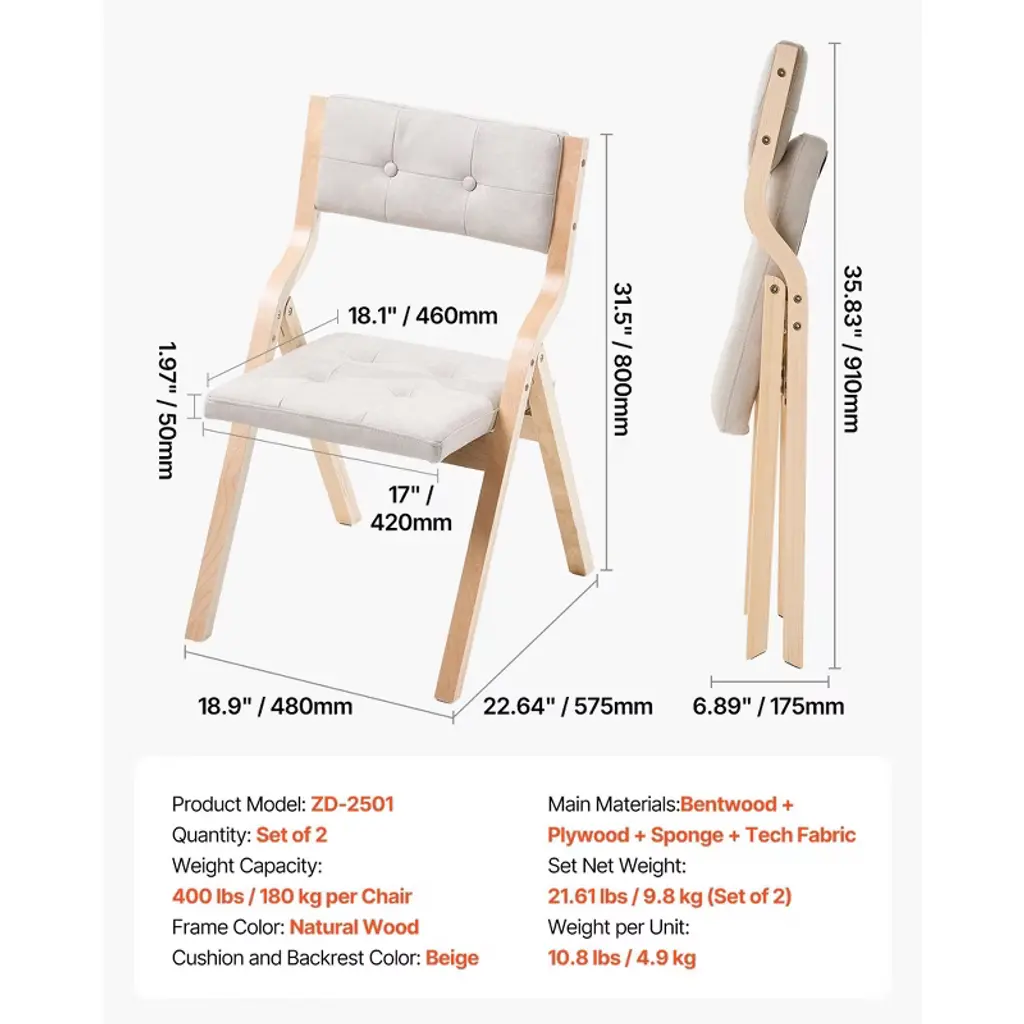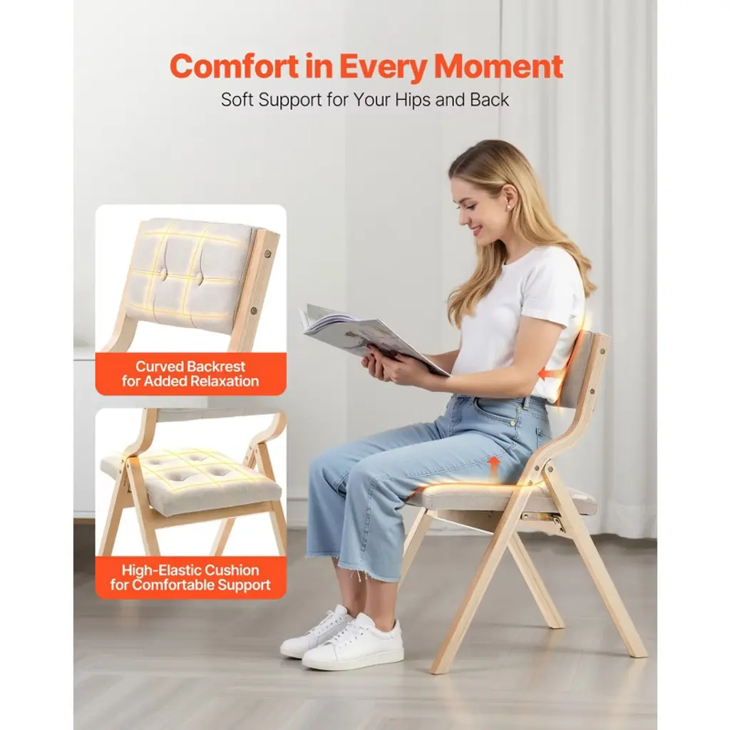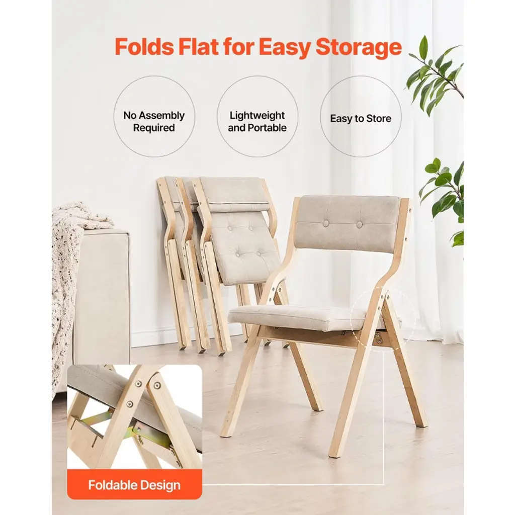 Vevor Wooden Folding Chairs With Cushion, Set Of 2, Portable Foldable Cushion Chair With Wooden Frame, Modern Padded Dining Chair, Beige